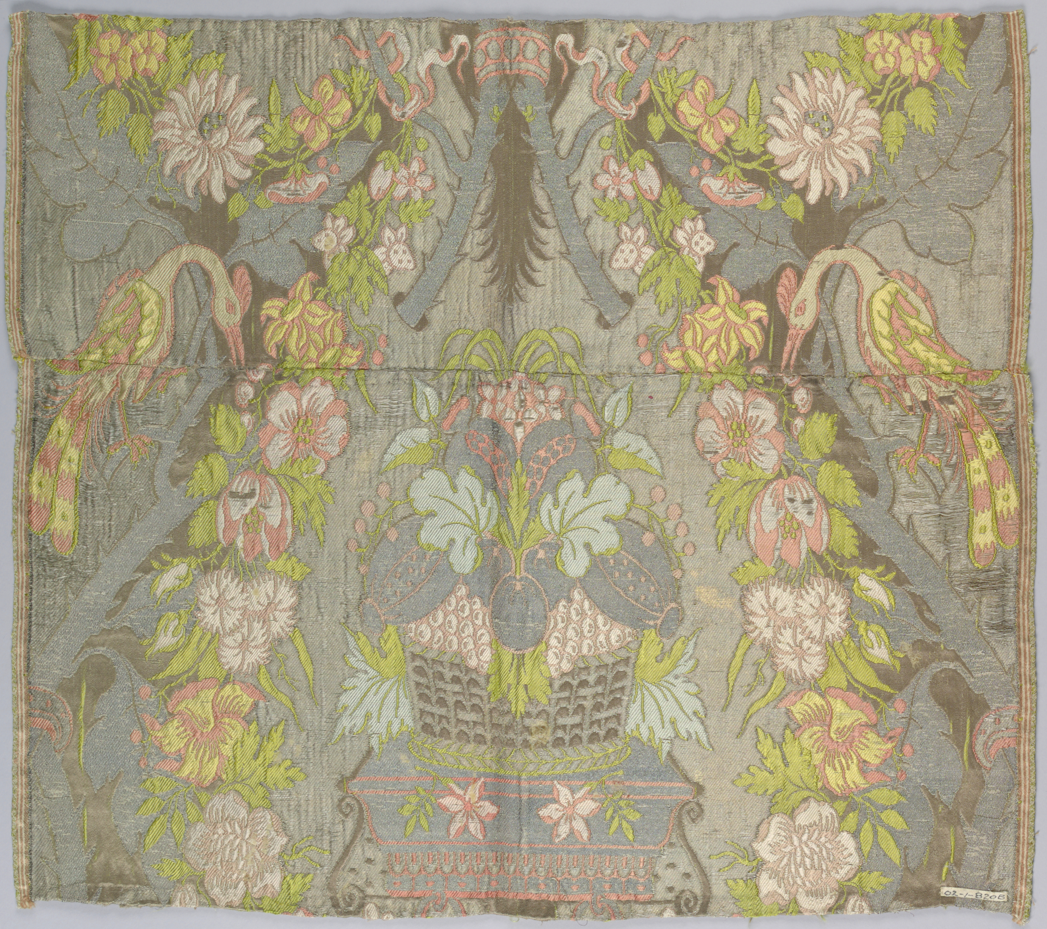 This is a Chasuble fragments. It is dated 1705–15 and we acquired it in 1902. Its medium is silk, metallic and its technique is 4&1 satin patterrnd by discontinuous supplementary wefts bound by supplementary warp. It is a part of the Textiles department.