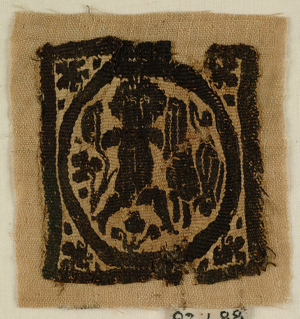 This is a Fragment. It is dated 3rd–4th century and we acquired it in 1902. Its medium is warp; s-spun linen. wefts; s-spun linen, s-spun wool and its technique is slit tapestry with supplementary weft wrapping. It is a part of the Textiles department.