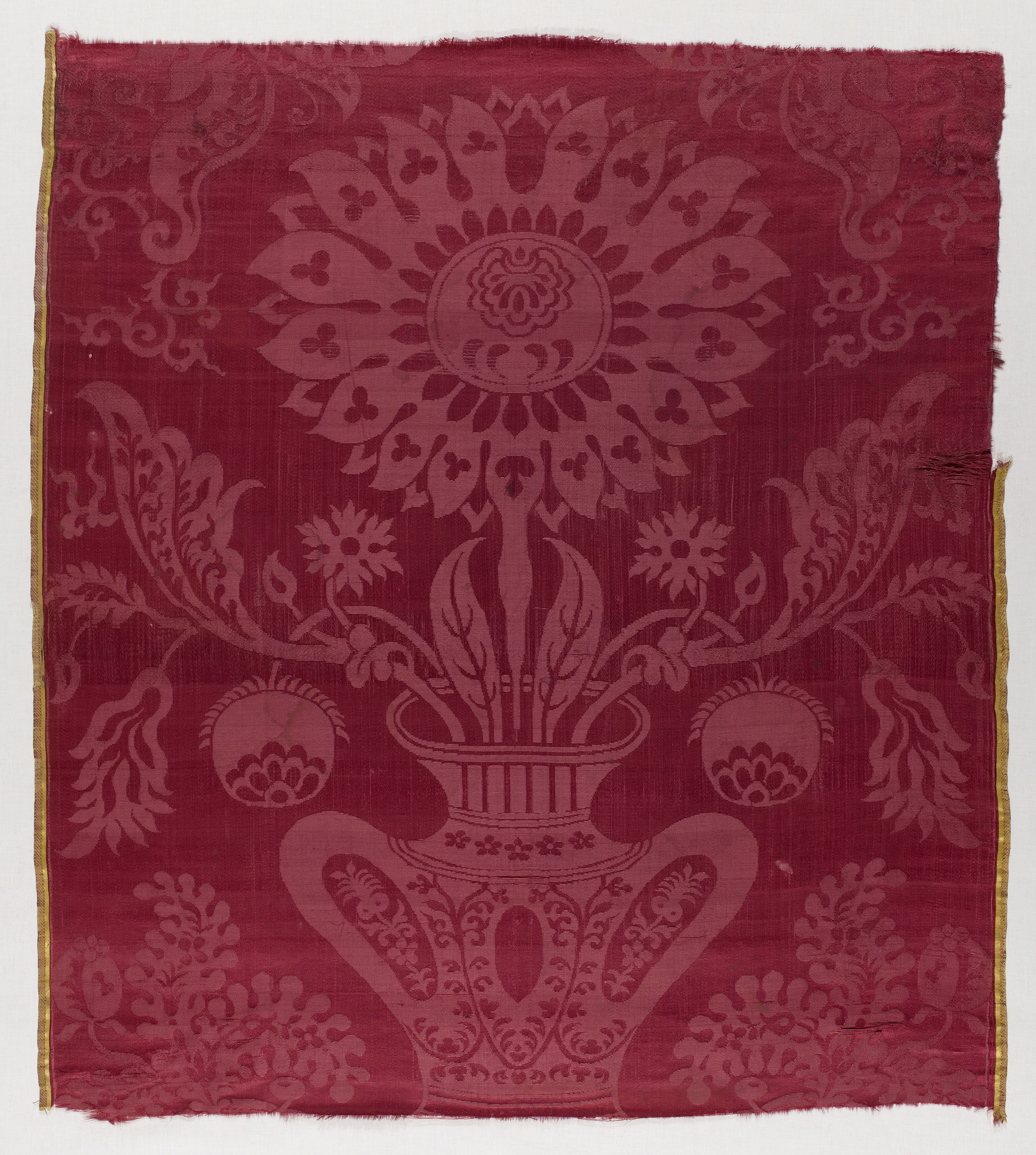 This is a Fragment. It is dated early 18th century and we acquired it in 1902. Its medium is silk and its technique is 7&1 satin damask. It is a part of the Textiles department.