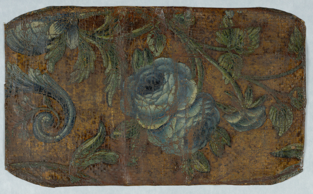 This is a Leather. We acquired it in 1903. Its medium is leather, stamped, silvered, painted. It is a part of the Wallcoverings department.