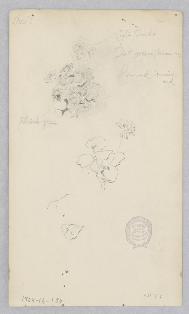 Numbered in graphite, upper left corner: (105); Inscribed in graphite, upper right (artist's hand): Light Scarlet/ Dull green (brown rings/ Ground brownish/red; in graphite, lower left corner: 1904-16-134; in graphite, lower right corner: 1877
