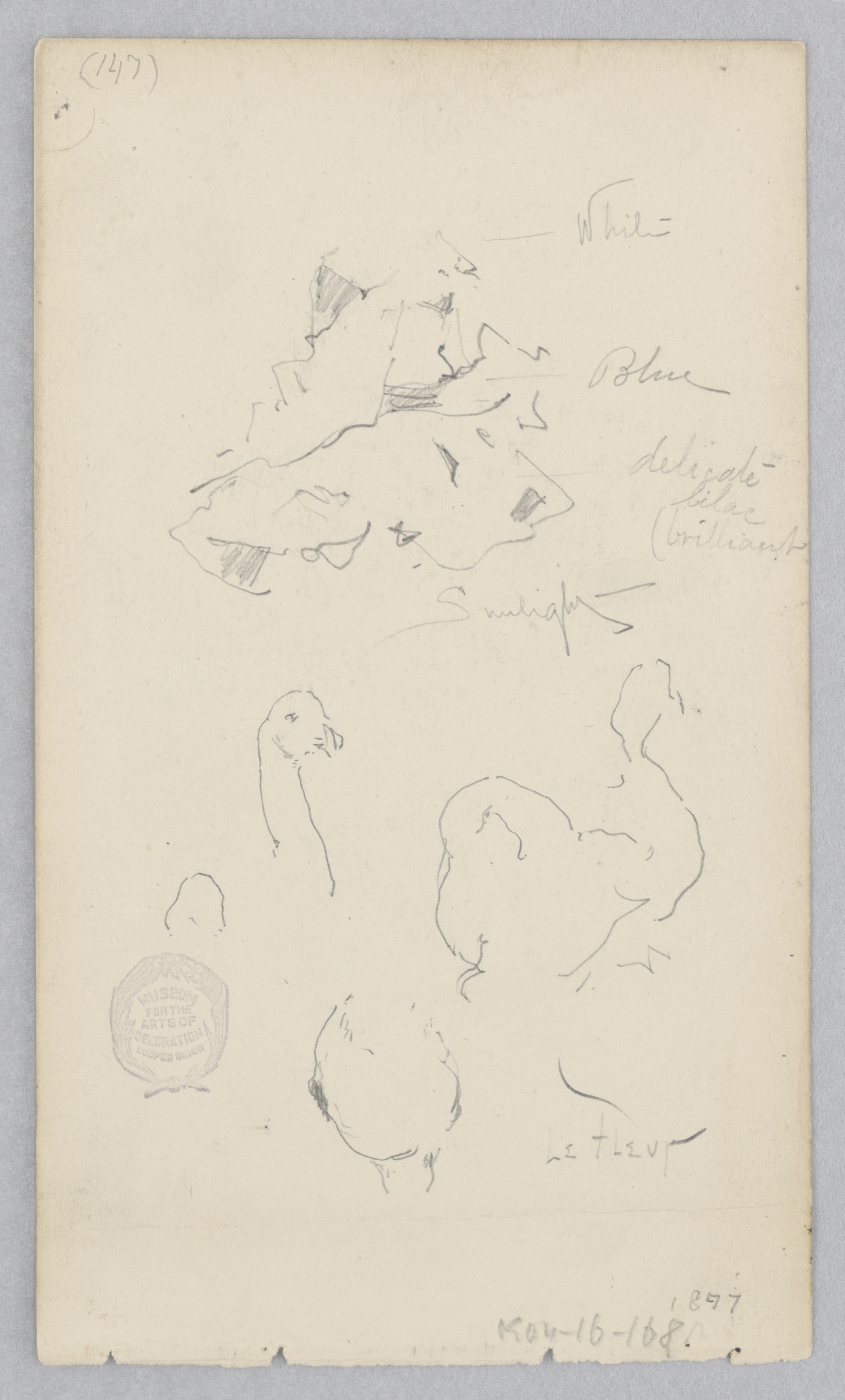 Recto: Numbered in graphite, upper left corner: (147); Inscribed in graphite, center right (artist's hand): White/ Blue/ delicate/ (brilliant/ Sunlight/ Le fleur; in graphite, lower right corner: 1877; Verso: Inscribed in graphite, lower right: 1877.