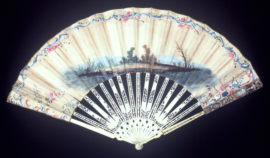 This is a Pleated fan and case. It is dated ca. 1780 and we acquired it in 1906. Its medium is gilded and gouache-painted vellum leaf; carved à jour, silvered, gilded, and painted ivory sticks. It is a part of the Textiles department.