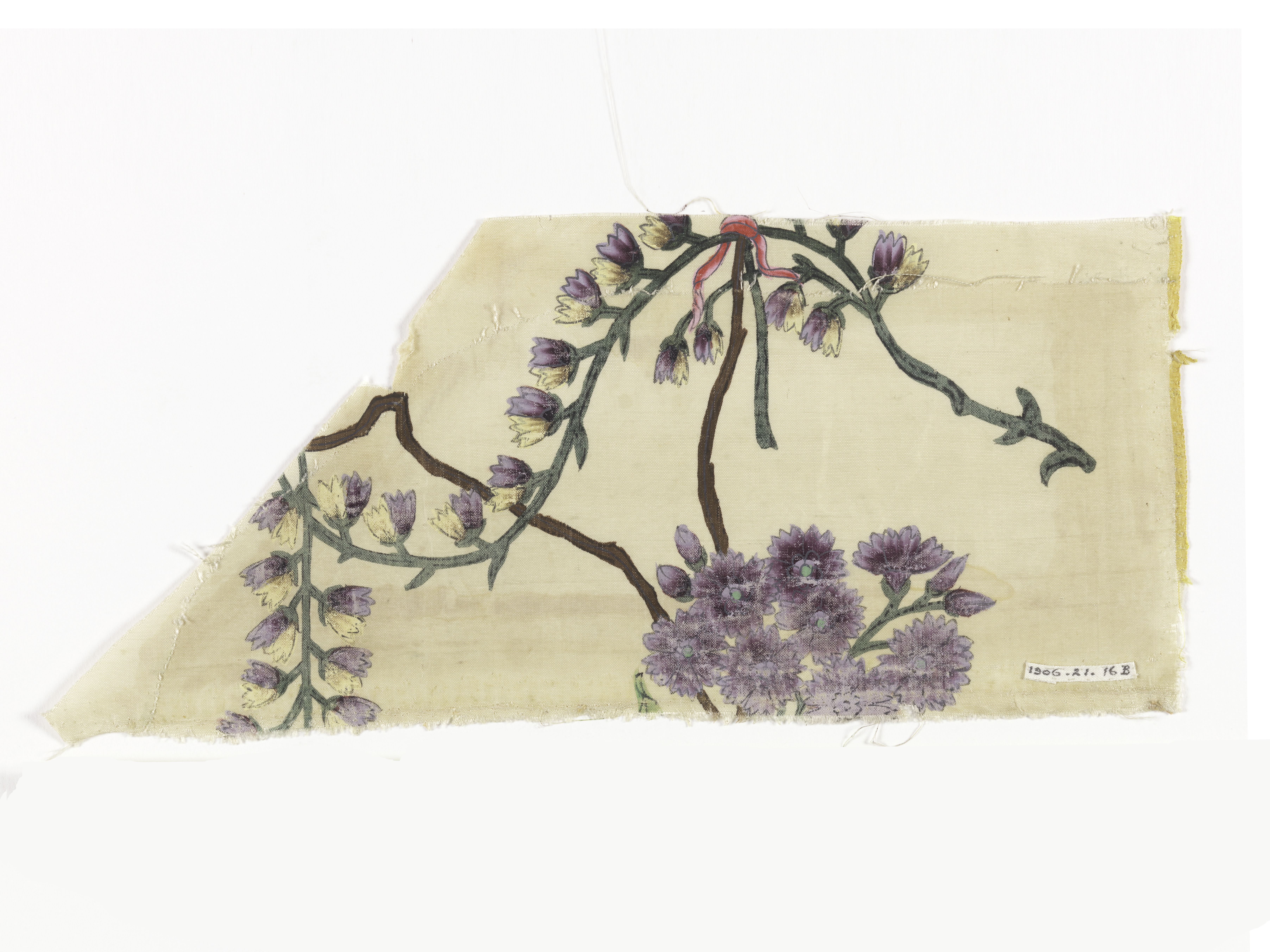 This is a Fragment. It is dated 18th century and we acquired it in 1906. Its medium is tempera on silk and its technique is printed and painted on plain weave. It is a part of the Textiles department.