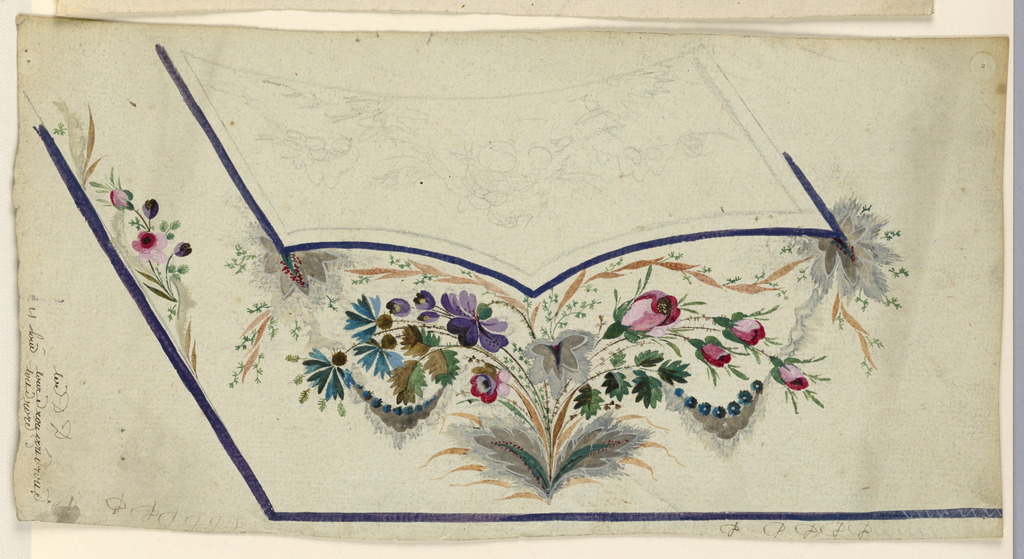 Drawing, Design for the Embroidery of a Man's Waistcoat; France; traced, graphite, brush and gouache on paper; 17.4 × 34.3 cm (6 7/8 × 13 1/2 in.); Gift of Jacob H. Schiff; 1906-21-228