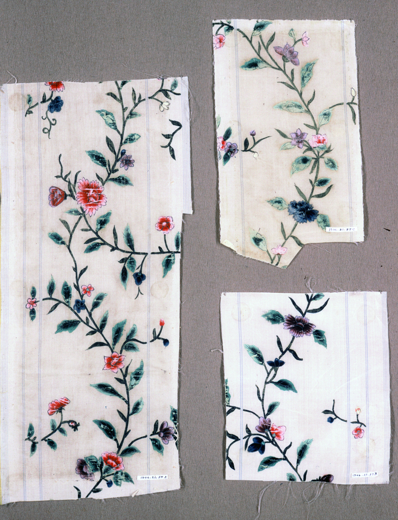 This is a Fragment. It is dated 18th century and we acquired it in 1906. Its medium is tempera on silk and its technique is printed and painted on plain weave. It is a part of the Textiles department.