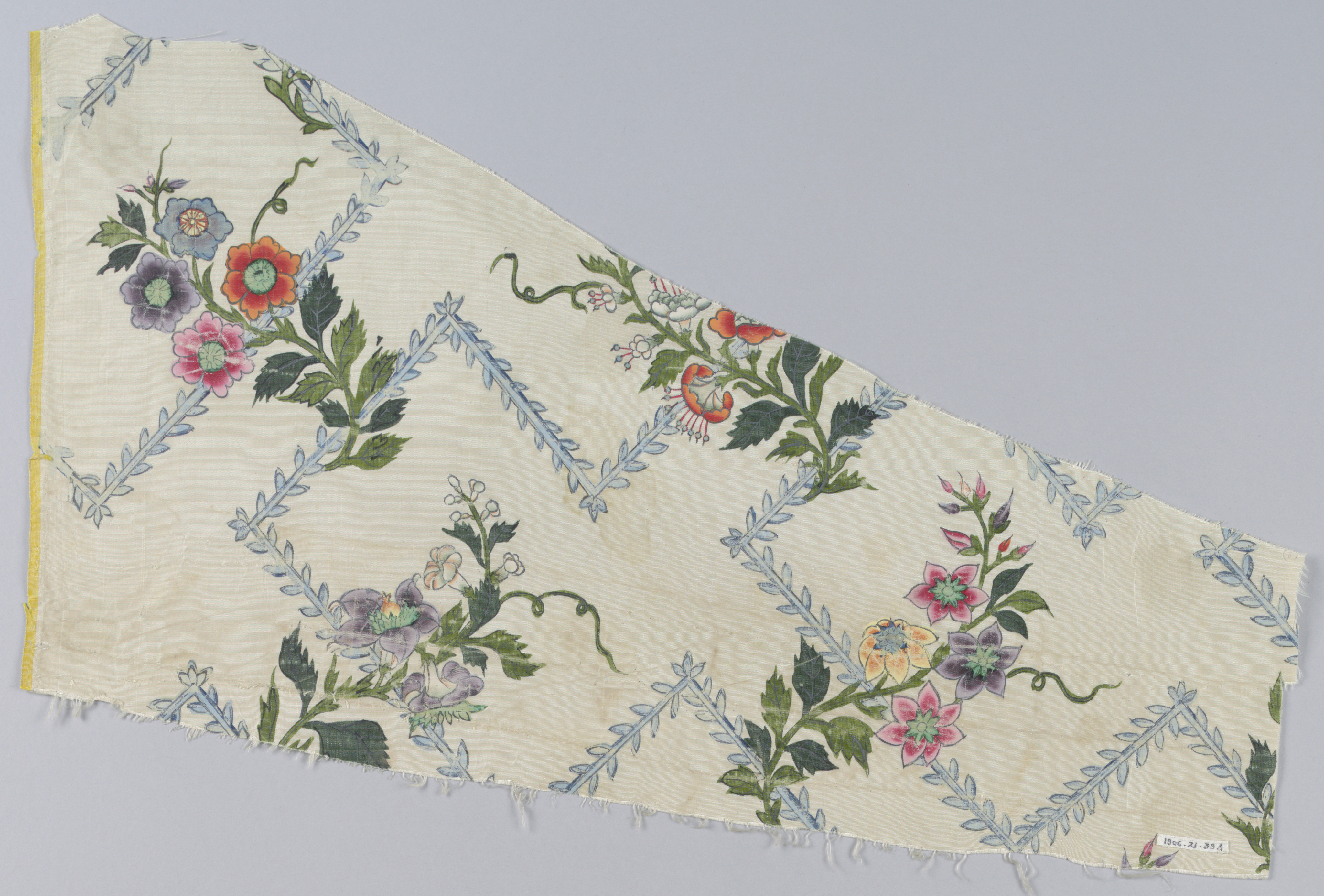 This is a Fragments. It is dated 18th century and we acquired it in 1906. Its medium is silk and its technique is printed and painted on plain weave. It is a part of the Textiles department.