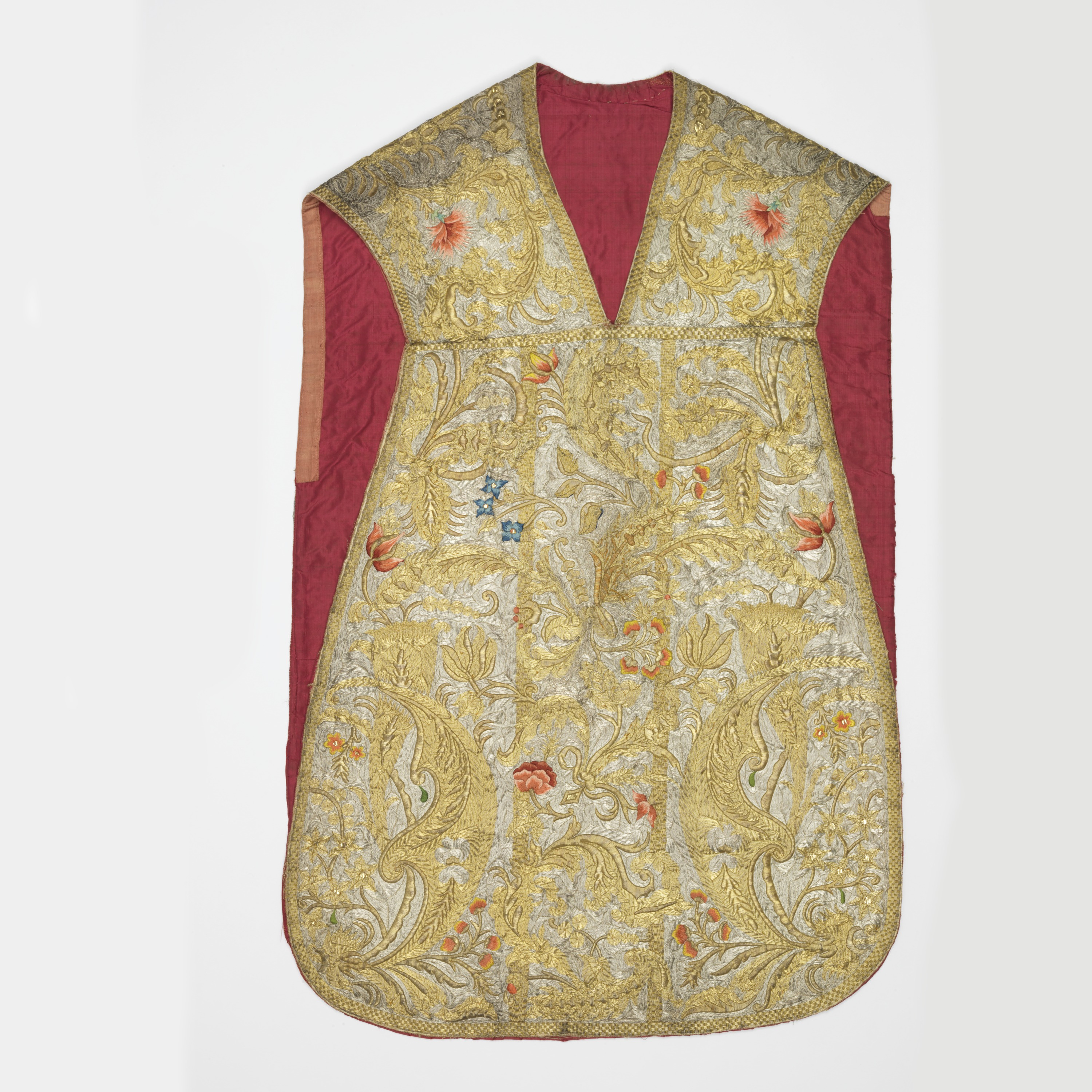 This is a Chasuble. It is dated 18th century and we acquired it in 1907. Its medium is silk and metallic embroidery, silk foundation, linen backing, silk lining and its technique is embroidered in couching and satin stitches. It is a part of the Textiles department.