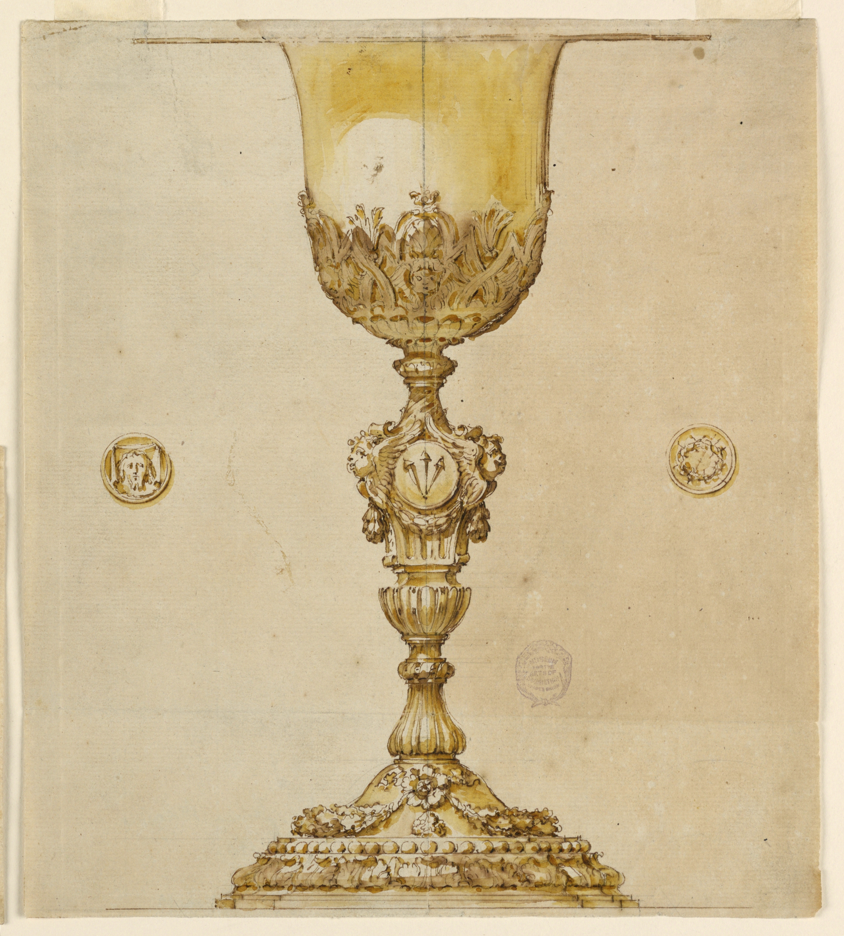 Drawing, Design for a Chalice, Elevation; Flaminio Innocenzi Minozzi (Italian, 1735 – 1817); pen and ink with ink and yellow washes on paper; 22.3 × 25.1 cm (8 3/4 × 9 7/8 in.); 1908-18-1-b