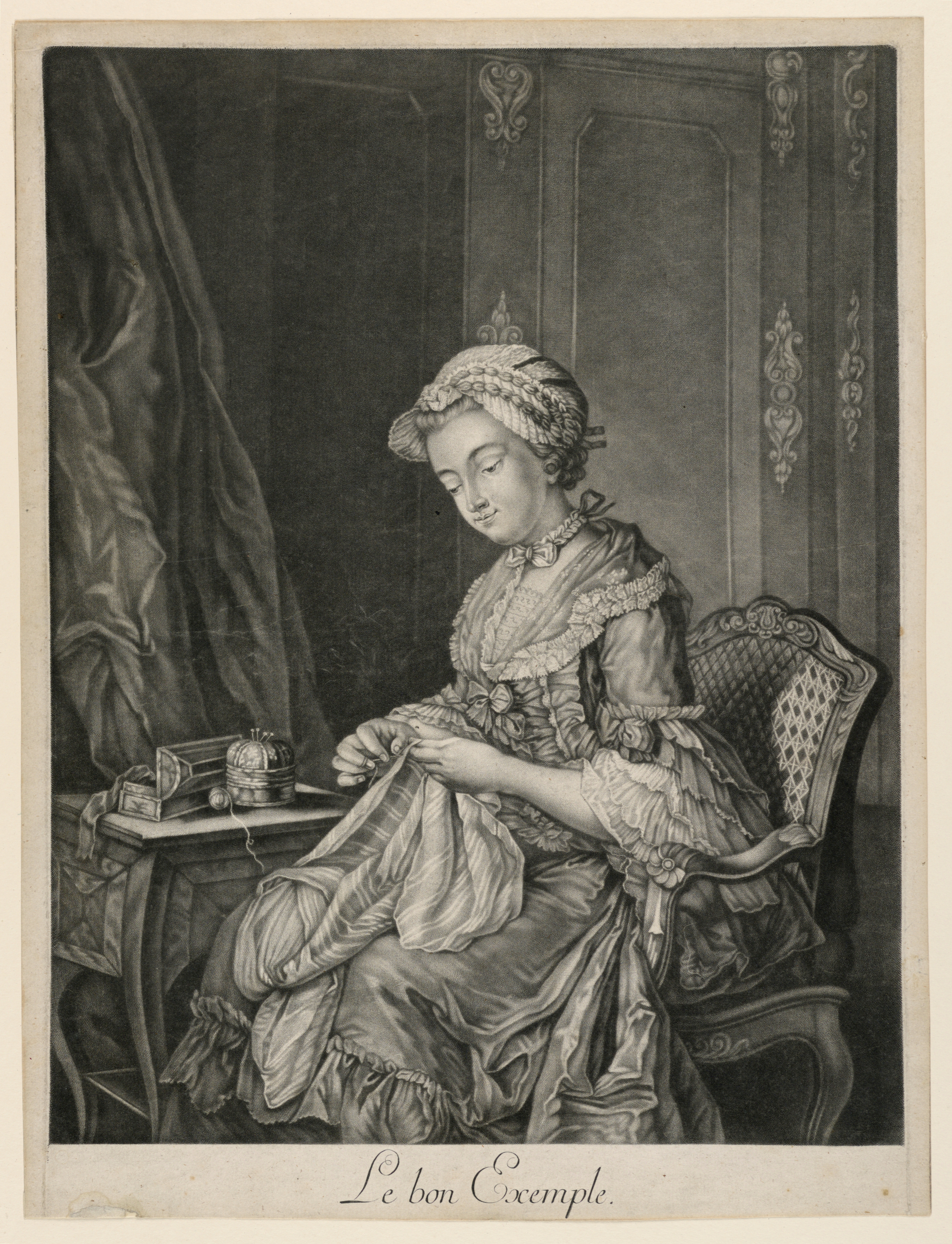 Print, Le Bon Exemple; After Johann Kaspar Heilmann (German, 1718 - 1760); France; mezzotint on paper; Plate: 41.9 × 30.7 cm (16 1/2 × 12 1/16 in.) Paper: 42.8 × 32.3 cm (16 7/8 × 12 11/16 in.); Bequest of Katherine Strong Welman; 1908-23-54