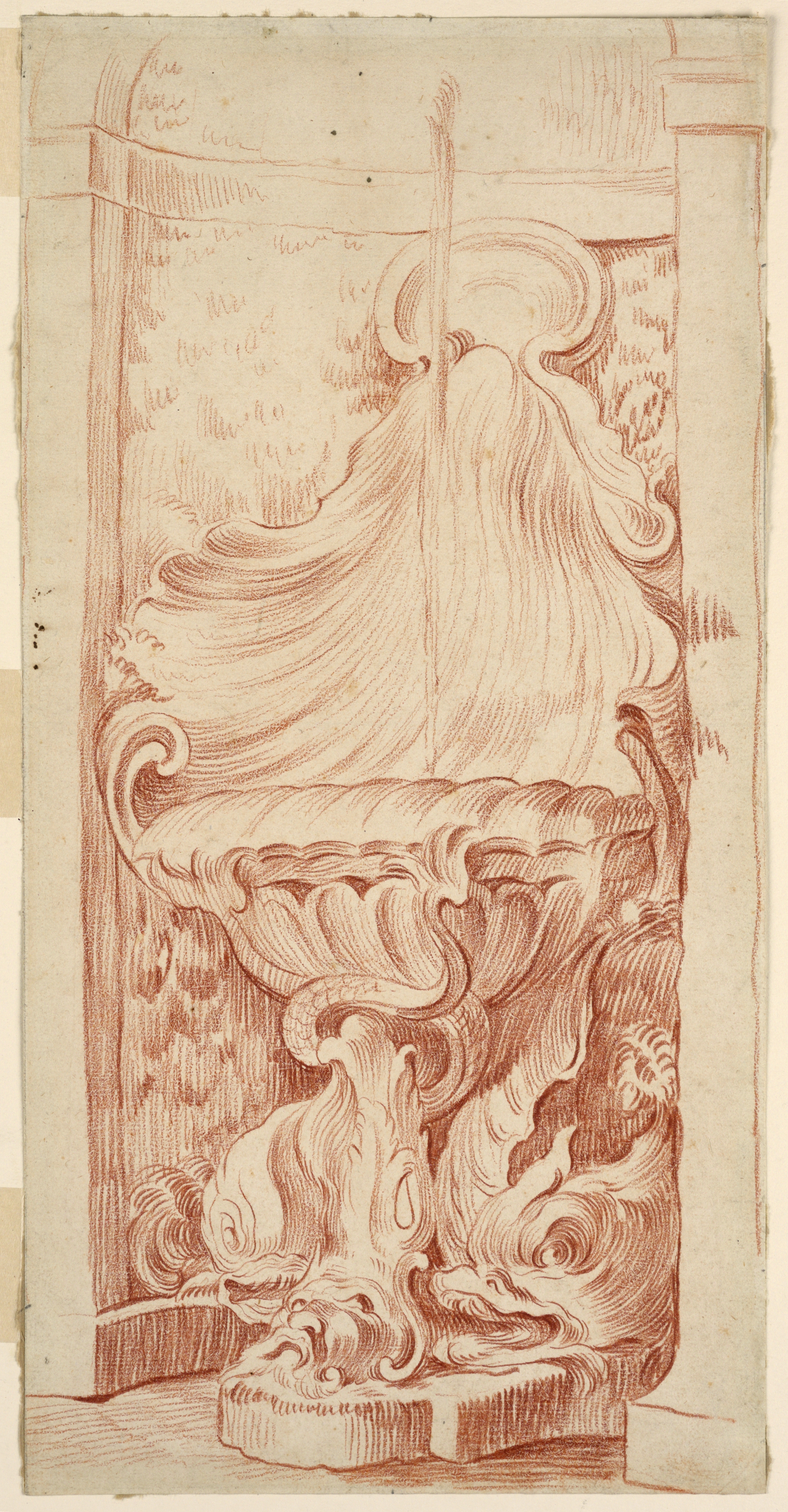 Drawing, Design for Fountain in Niche; After Edmé Bouchardon (French, active Rome and France, 1698 - 1762); France; red chalk on off-white laid paper; 38.3 x 19.2 cm (15 1/16 x 7 9/16 in.) ; Purchased for the Museum by the Advisory Council; 1908-26-133
