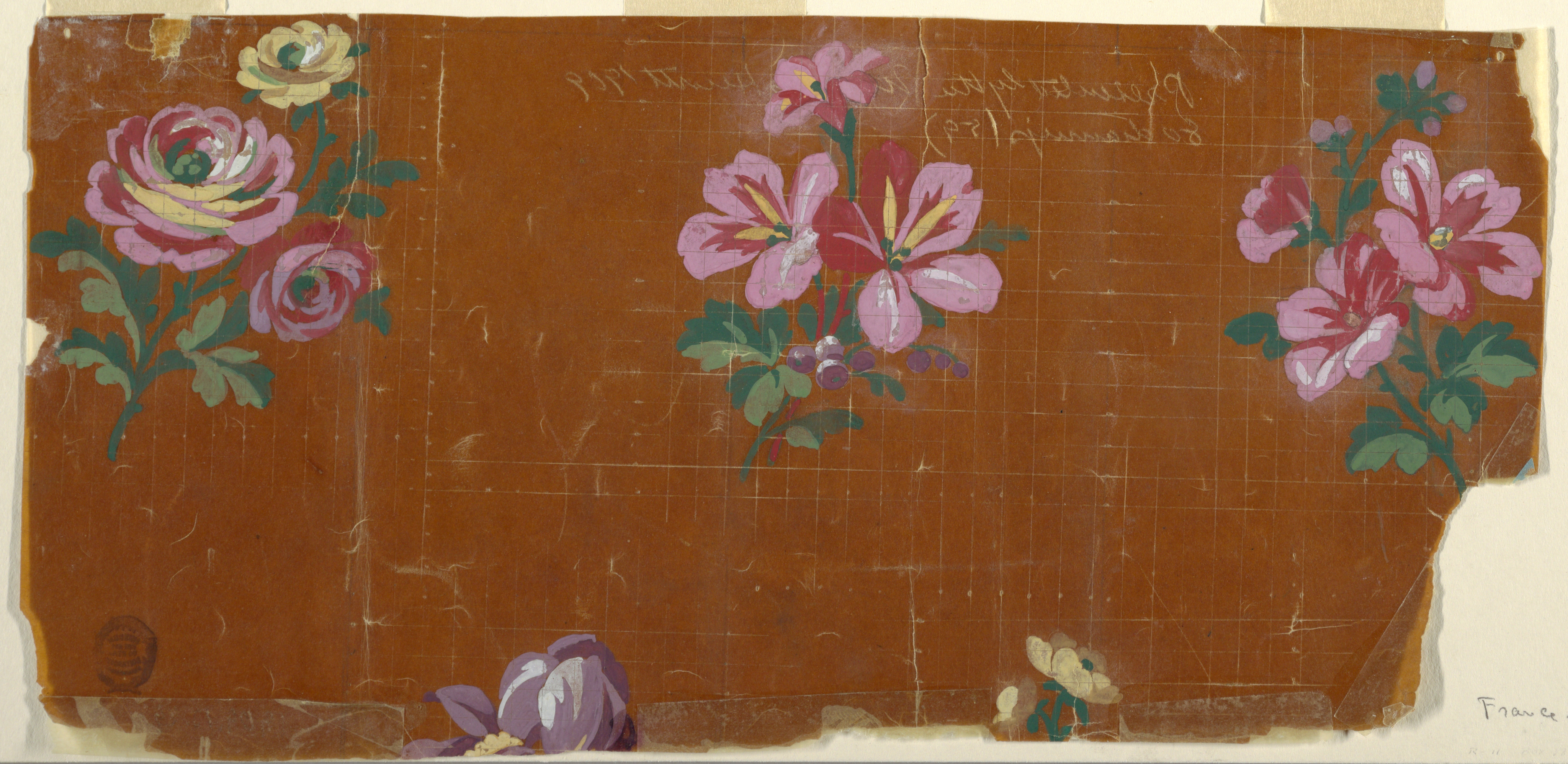 Drawing, Design for a Silk Brocade, Fragment; France; impressed squaring, brush and gouache on oily tracing paper; 17.9 × 36.6 cm (7 1/16 × 14 7/16 in.); Gift of Eleanor and Sarah Hewitt; 1909-13-29