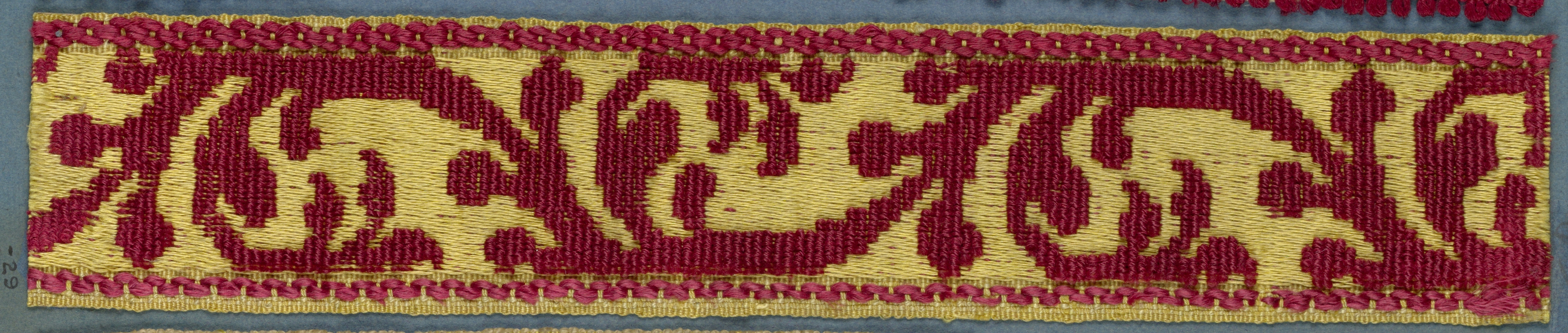 This is a Trimming. It is dated 19th century and we acquired it in 1909. Its medium is silk and its technique is uncut supplementary warp pile on satin ground (velvet). It is a part of the Textiles department.