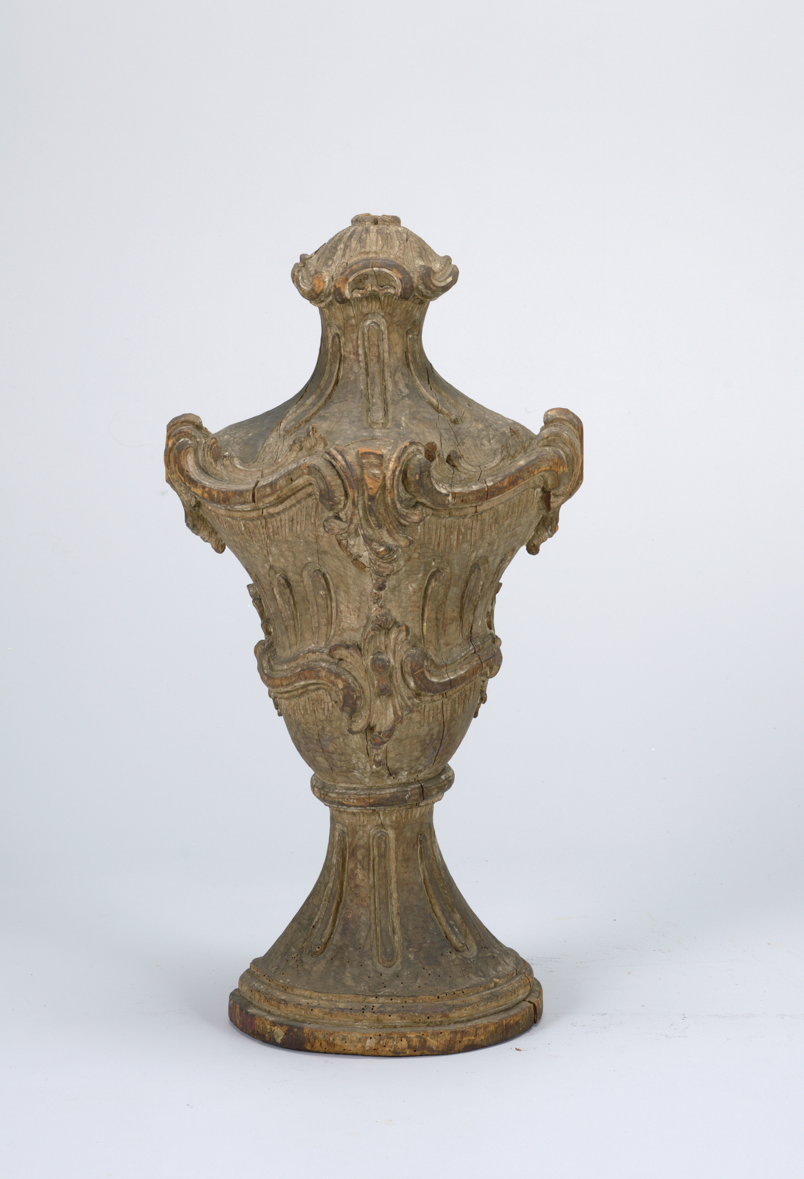 This is a urn. It is dated ca. 1740 and we acquired it in 1910. Its medium is wood, carved. It is a part of the Product Design and Decorative Arts department.