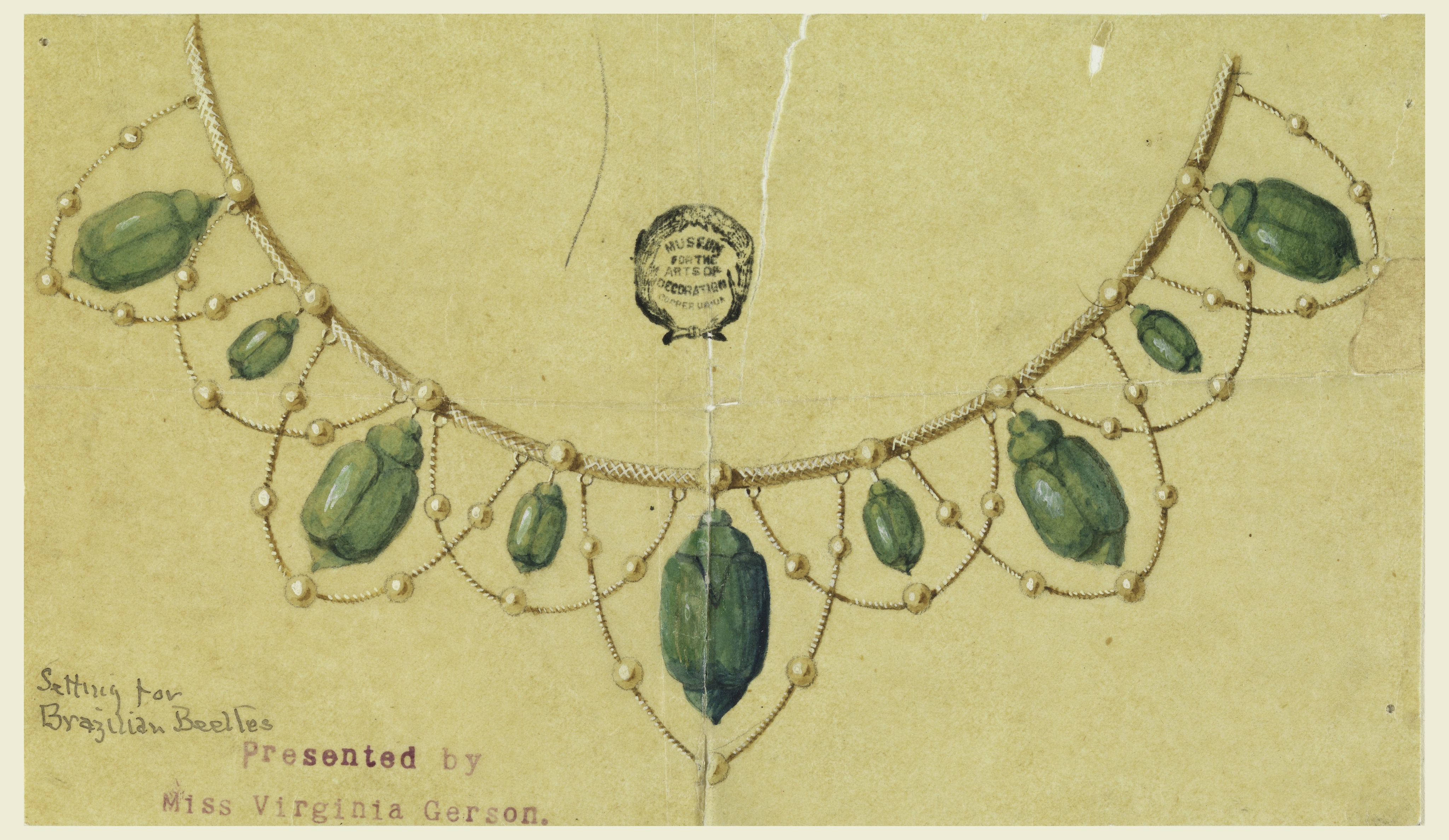 Drawing, Design for Necklace with Brazilian Beetles; USA; graphite, brush and watercolor, white heightening on tracing paper; 11.2 x 19 cm (4 7/16 x 7 1/2 in.); 1910-44-4