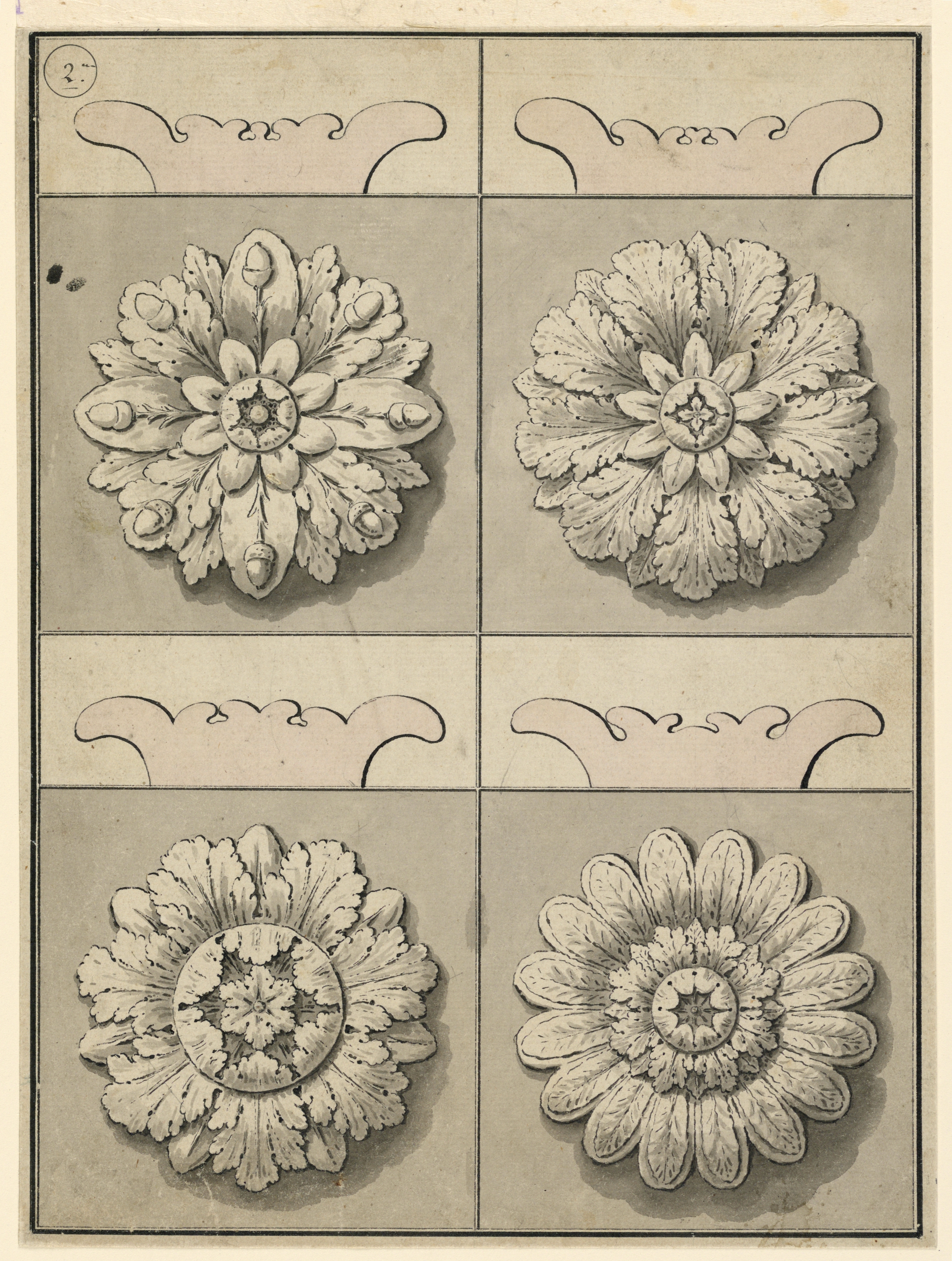 Drawing, Design for rosettes; France; pen and chinese ink, brush and watercolor, graphite on paper; 31.4 × 23.6 cm (12 3/8 × 9 5/16 in.); Purchased for the Museum by the Advisory Council; 1911-28-118