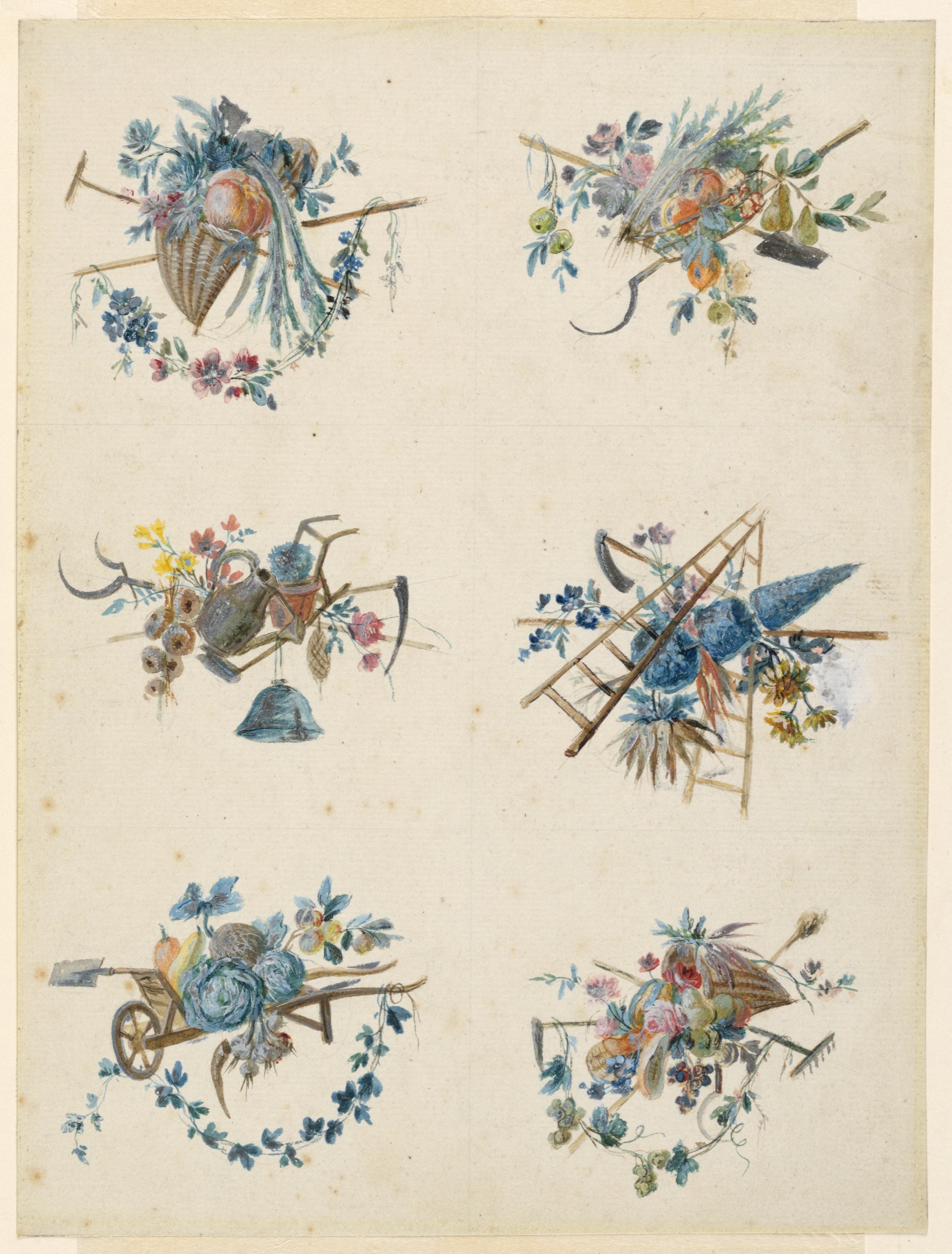 Drawing, Six Trophies with the Attributes of Gardening; Designed by Pierre Ranson (French, 1736–1786); France; graphite, pen and ink, brush and gouache on paper; 27 x 20.3 cm (10 5/8 in. x 8 in.); Purchased for the Museum by the Advisory Council; 1911-28-265