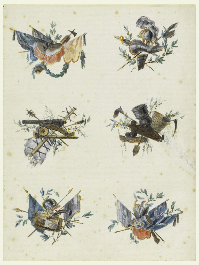Drawing, Six Trophies composed of Military Attributes; Designed by Pierre Ranson (French, 1736–1786); France; graphite, pen and ink, brush and gouache on paper; 26.9 x 20.3 cm (10 9/16 in. x 8 in.); Purchased for the Museum by the Advisory Council; 1911-28-267