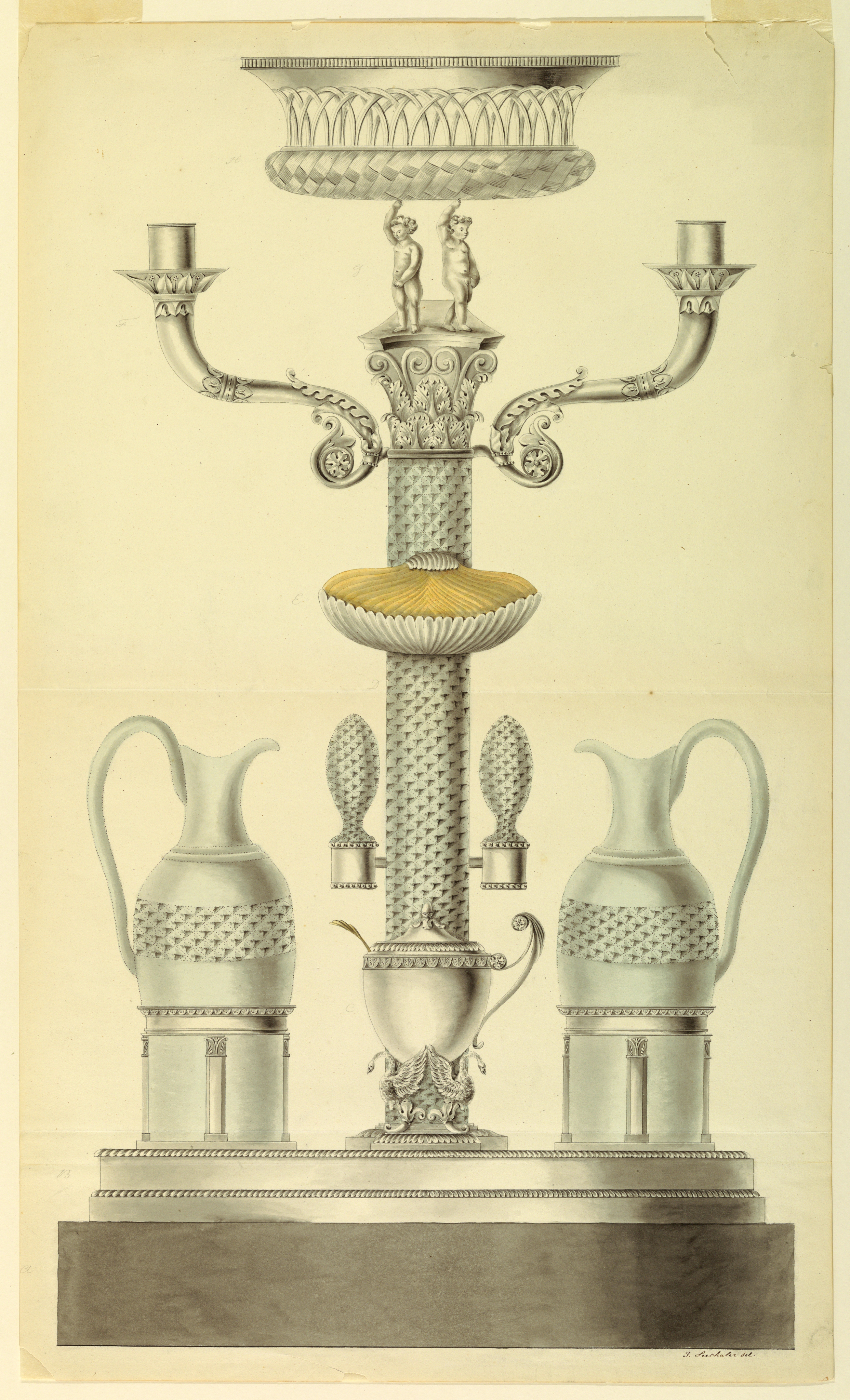 Drawing, Design of a Centerpiece; pen and ink, brush with light blue, light brown washes, graphite on paper; 71.5 × 42.9 cm (28 1/8 × 16 7/8 in.); Purchased for the Museum by the Advisory Council; 1911-28-332