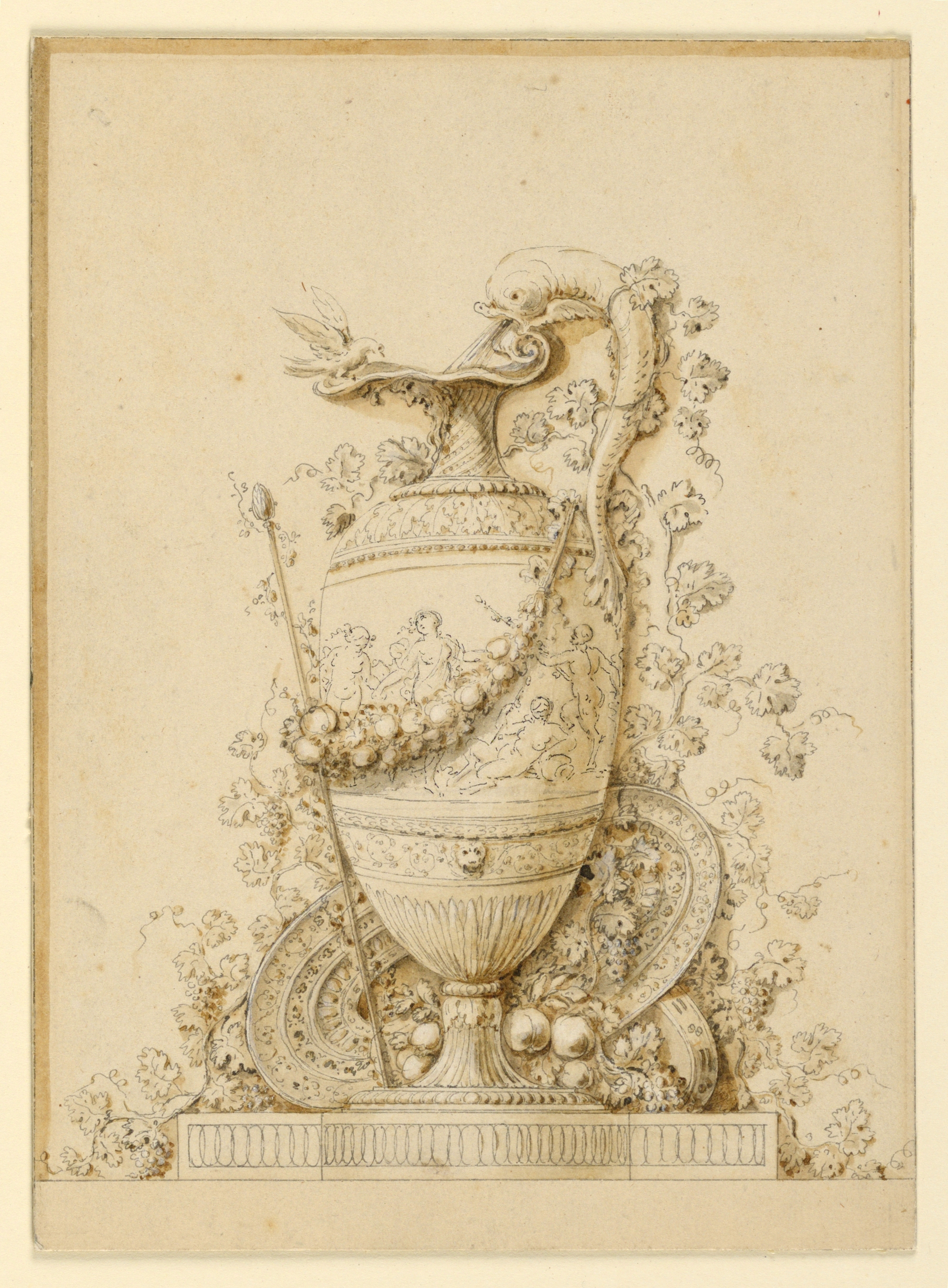 Drawing, Design for a panel decoration showing a ewer, for a plate in the "Recueil d' Ornements"; Gilles Paul Cauvet (French, 1731 - 1788); France; black chalk, pen and ink, brush and wash; Sheet: 21.4 x 15.6 cm (8 7/16 x 6 1/8 in.); Purchased for the Museum by the Advisory Council; 1911-28-34
