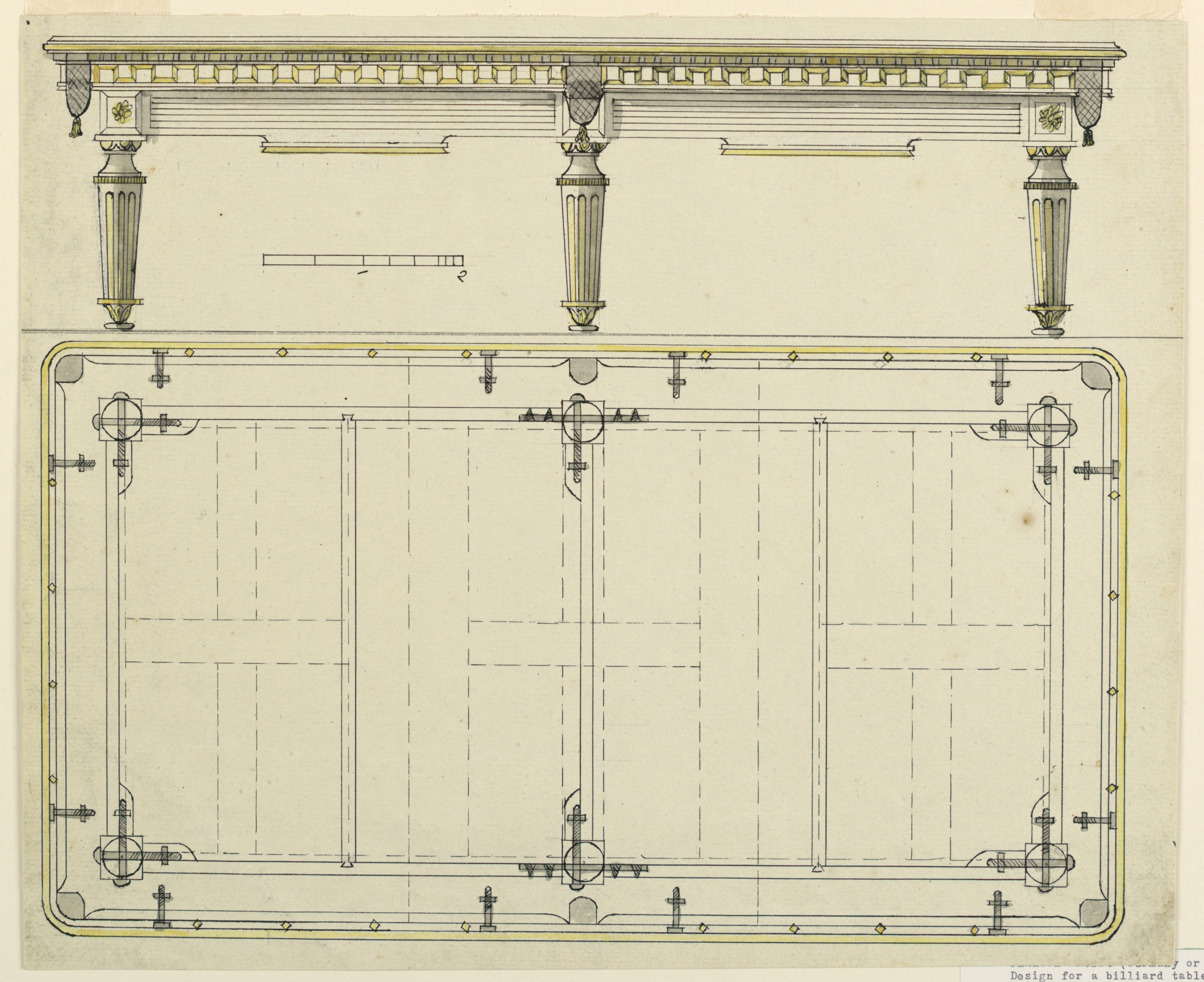 Drawing, Design for a Billiard Table; Germany; pen and black ink, brush and ink, yellow wash on paper; 27.3 x 33 cm (10 3/4 in. x 13 in.); Purchased for the Museum by the Advisory Council; 1911-28-480