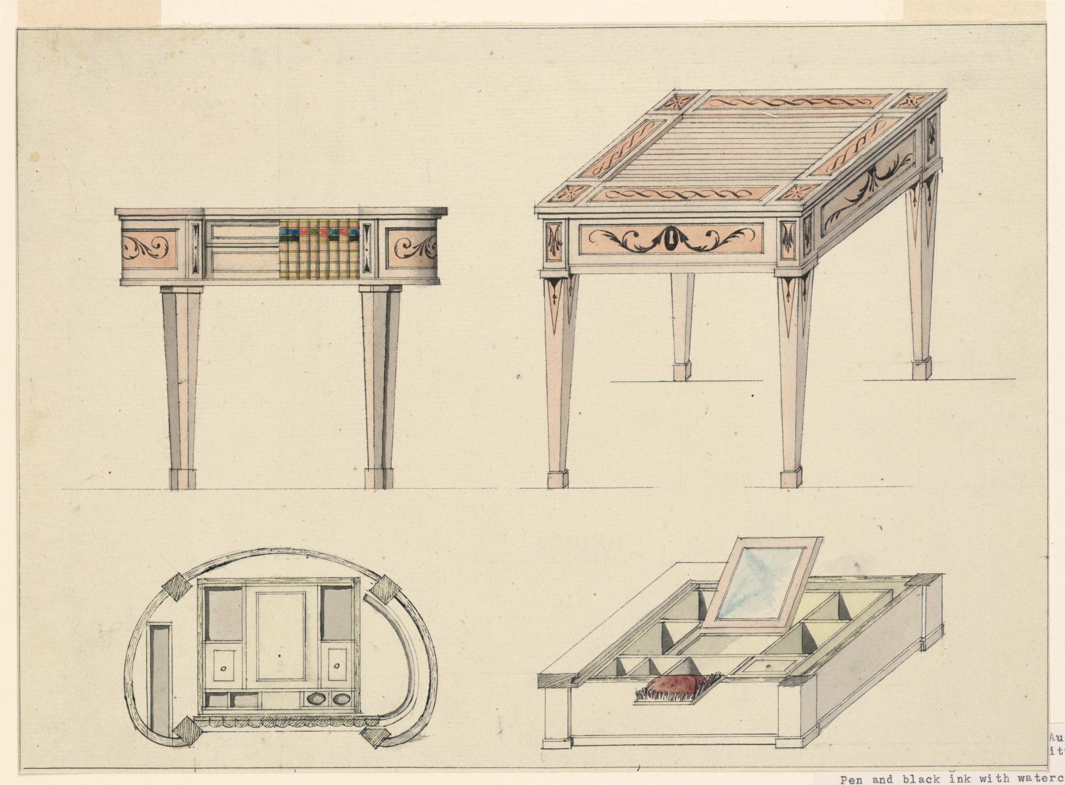Drawing, Designs for Mechanical Dressing and Writing Tables; pen and ink, brush and watercolor on paper; 20.5 × 28.3 cm (8 1/16 × 11 1/8 in.); Purchased for the Museum by the Advisory Council; 1911-28-489