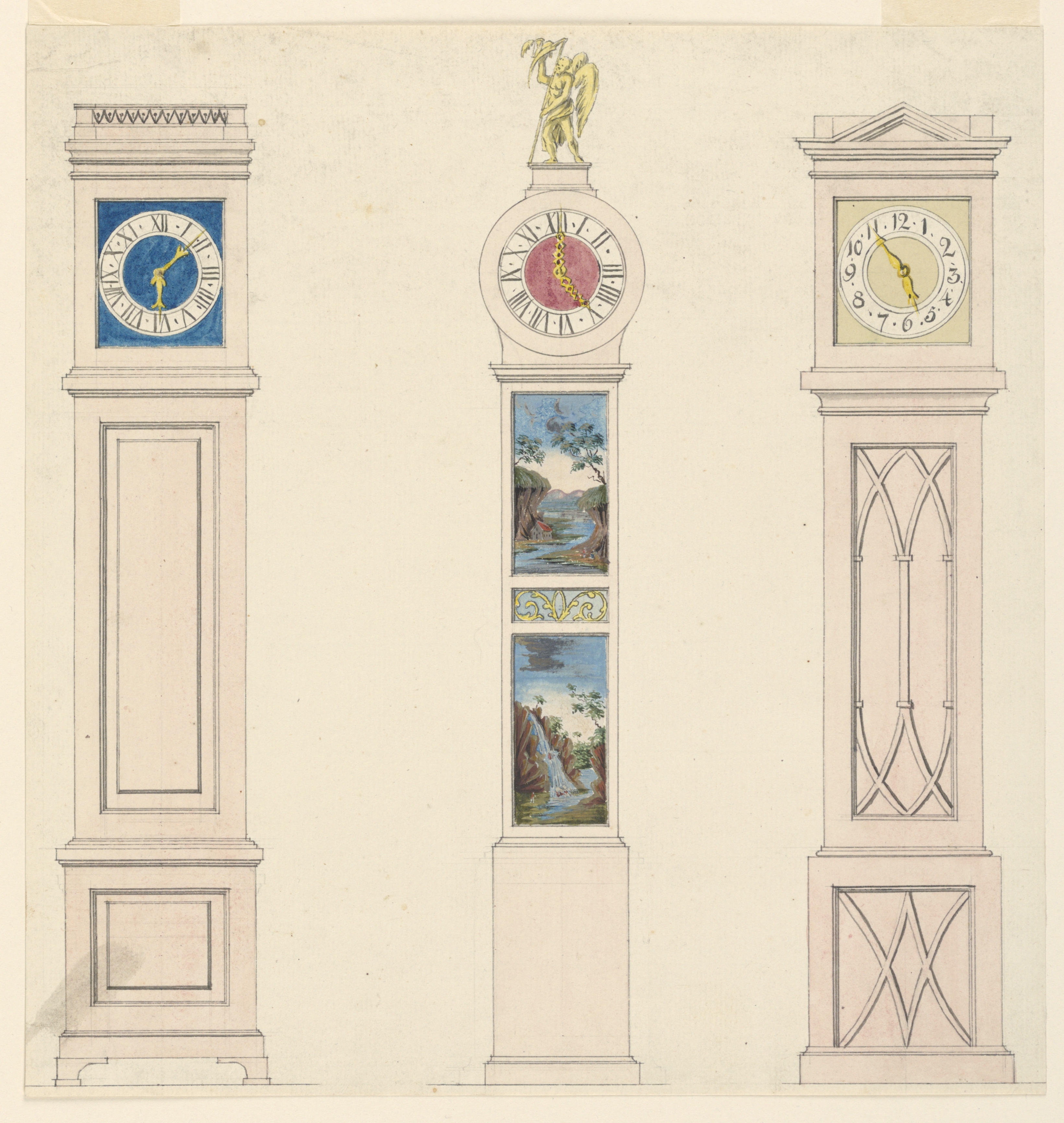 Drawing, Design for Case Clocks; Germany; graphite, pen and ink, brush and watercolor on paper; 27.9 x 26.6 cm (11 in. x 10 1/2 in.); Purchased for the Museum by the Advisory Council; 1911-28-496