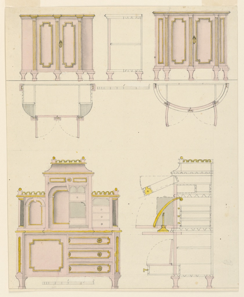 Drawing, Designs for Mechanical Furniture: Cabinet and Desk; Germany; pen and black ink, brush and watercolor on paper; 31.5 x 22.5 cm (12 3/8 x 8 7/8 in.); Purchased for the Museum by the Advisory Council; 1911-28-498