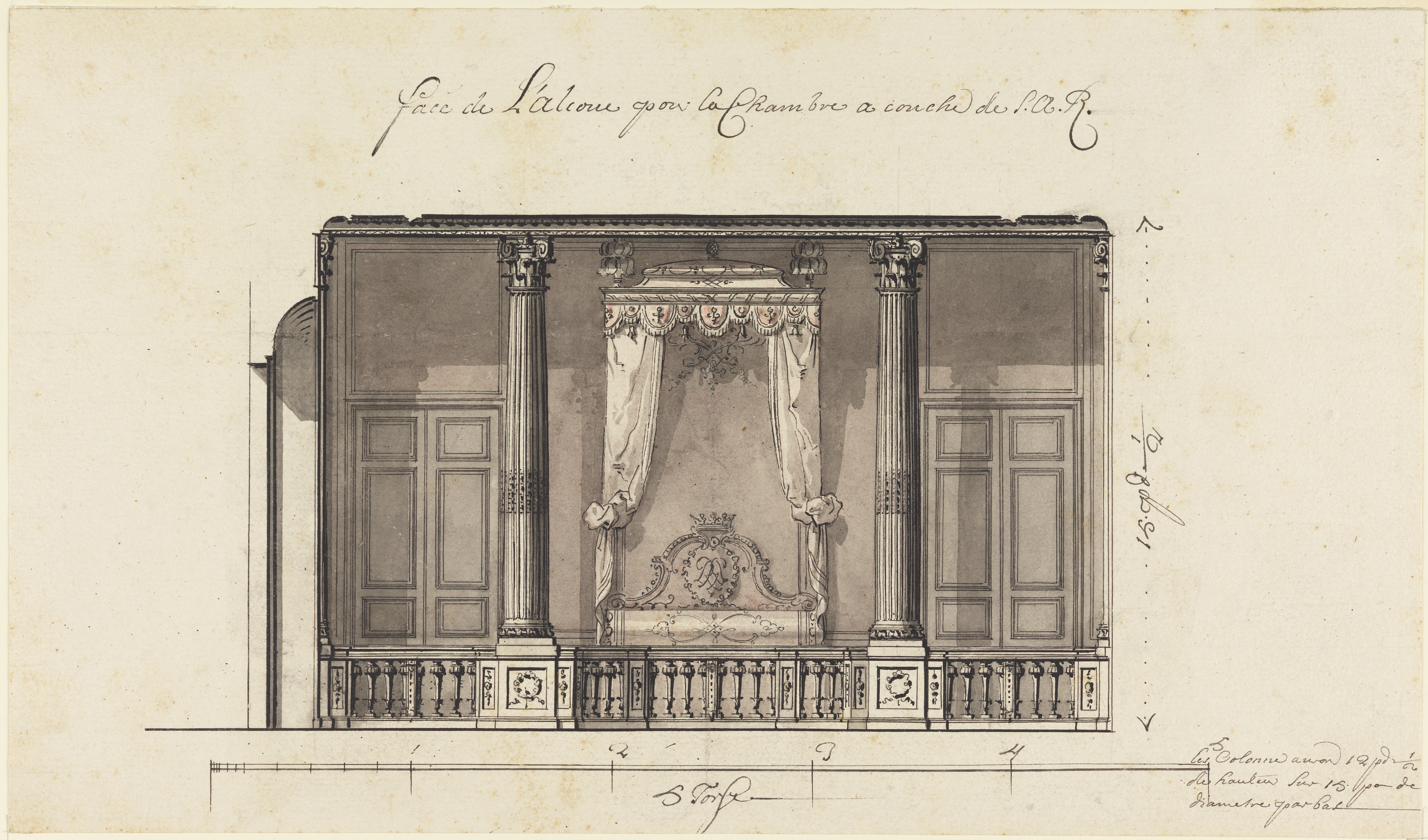 Inscribed in pen and black ink, upper margin: Face de L'alcove pour la chambre a coucher de S.A.R. Lower margin, the scale is inscribed: 5 toises; followed by: les Colonnes auron 12 pd 1/2/ de hauteur sur 15 pou (ce) de / diametre par bas
