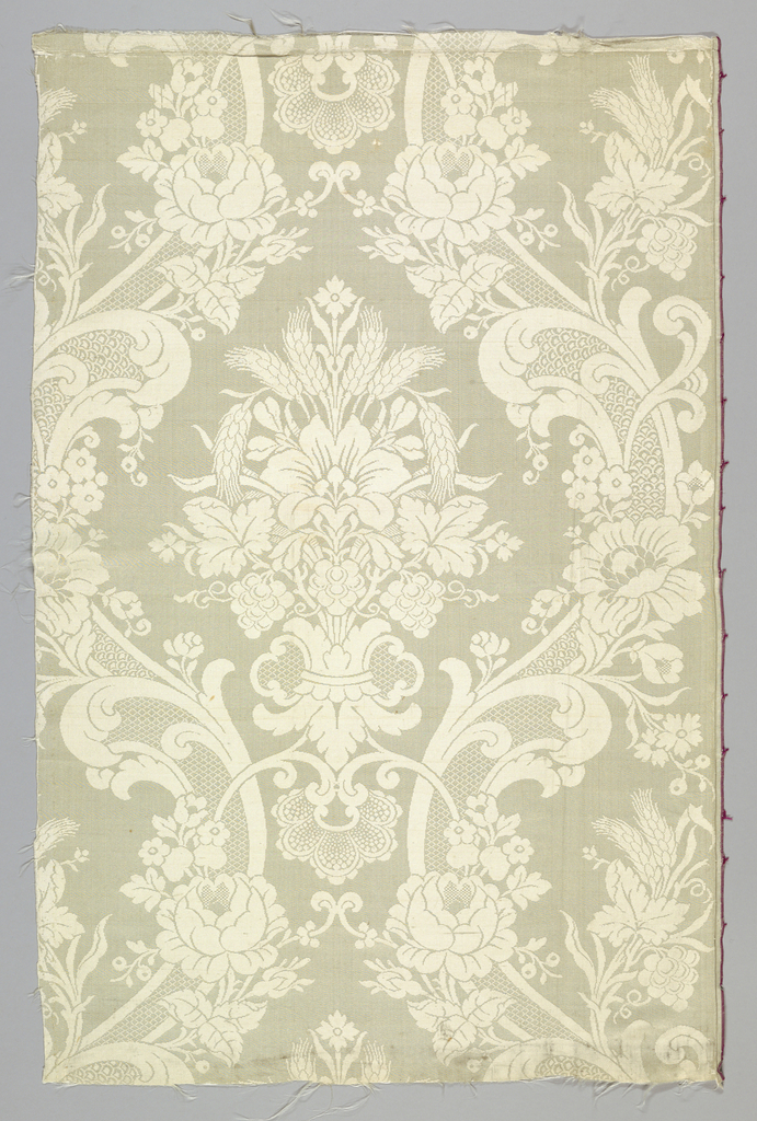This is a Fragment. It is dated 19th century and we acquired it in 1912. Its medium is silk and its technique is 5-harness satin damask. It is a part of the Textiles department.