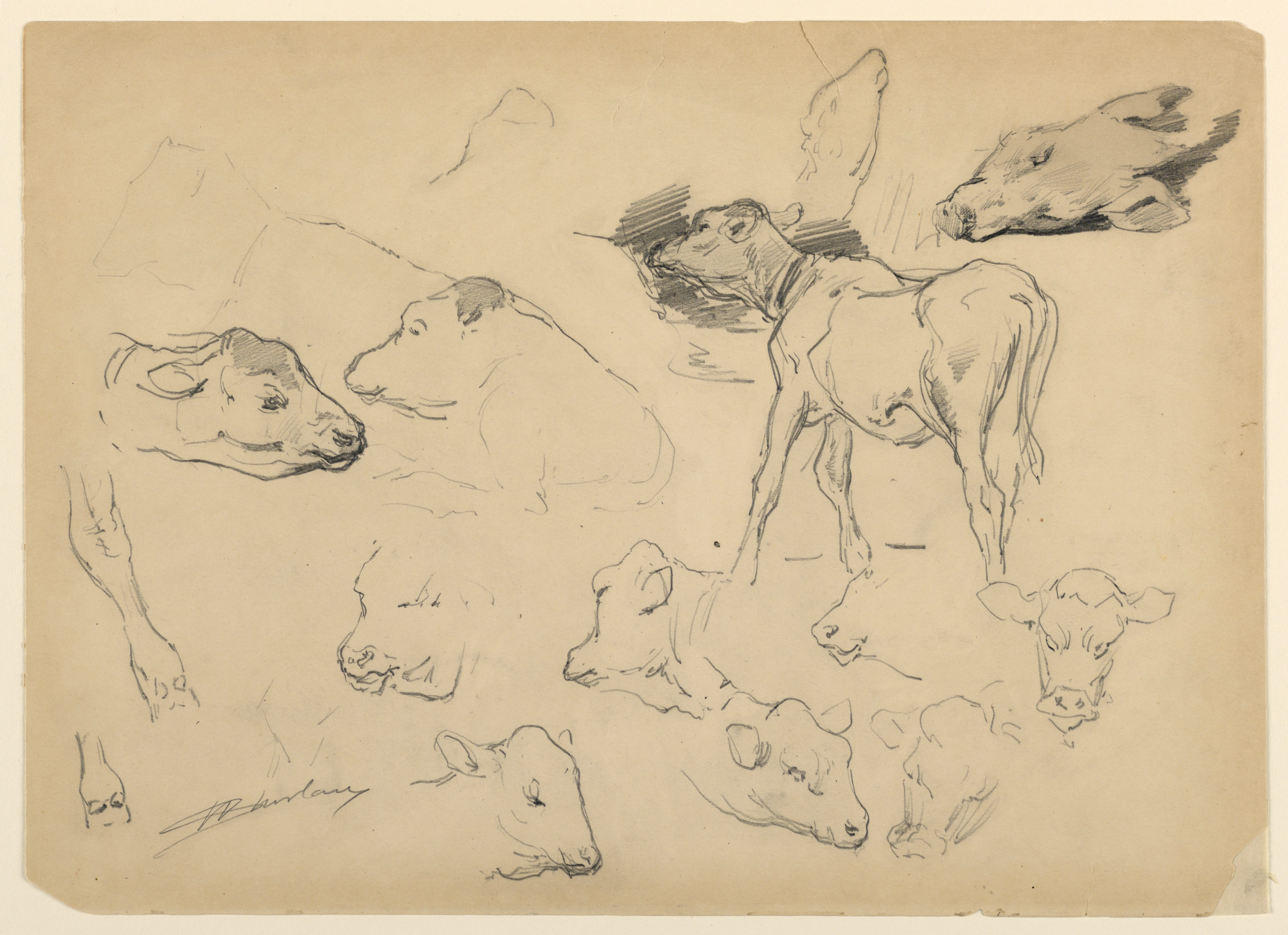 Drawing, Studies of Cattle, Heads of Sheep and a Hog; Walter Shirlaw (American, b. Scotland, 1838–1909); USA; graphite on cream-colored cardboard; 28.6 × 39.3 cm (11 1/4 × 15 1/2 in.); Gift of Mrs. Walter Shirlaw; 1912-16-111