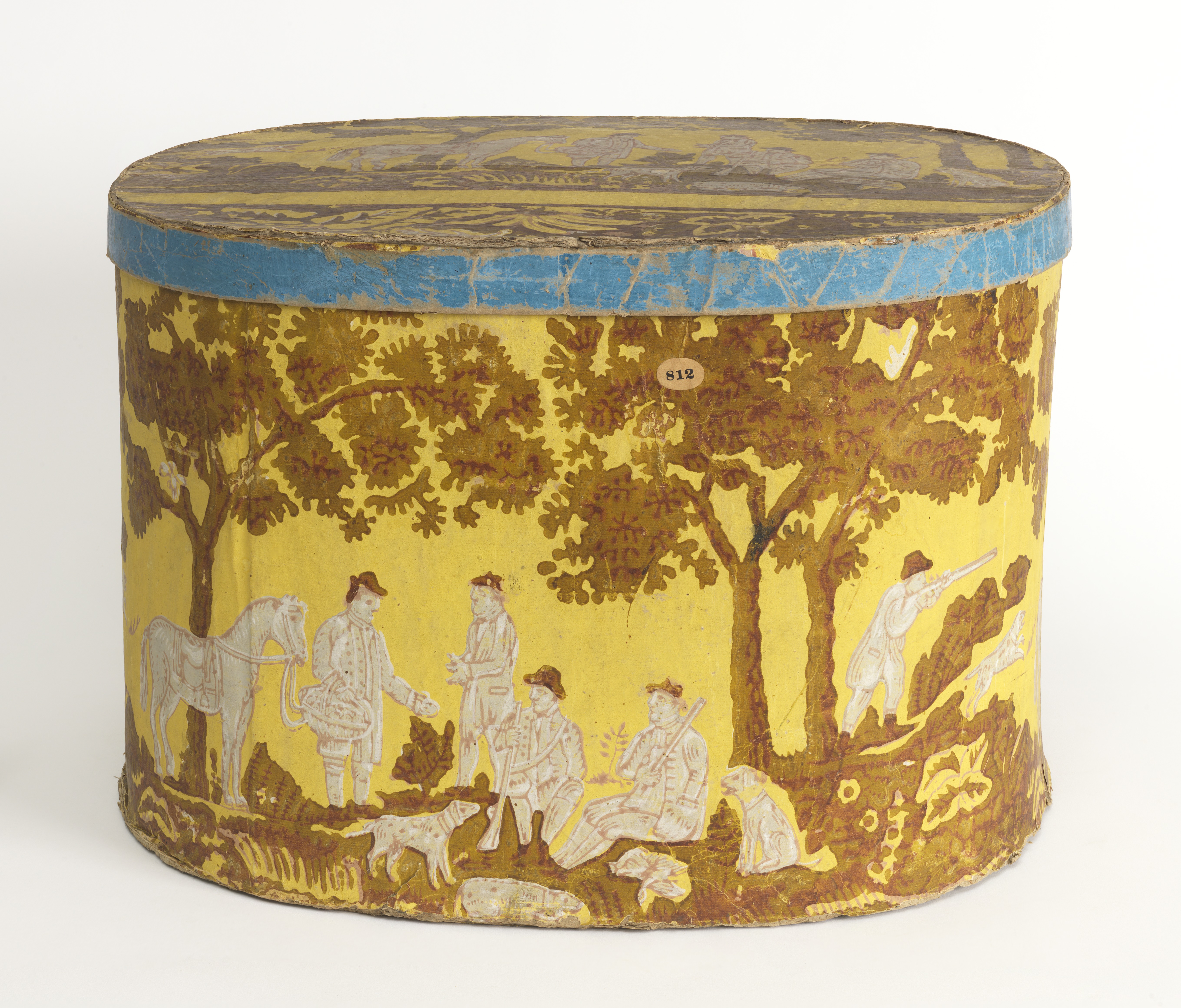 Bandbox (USA); block-printed on paper, pasteboard support; 44 x 35 x 29 cm (17 5/16 x 13 3/4 x 11 7/16 in.); Gift of Mrs. James O. Green; 1913-12-2-a,b