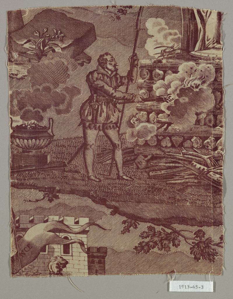 This is a Fragment. It is dated ca. 1820 and we acquired it in 1913. Its medium is cotton and its technique is printed on plain weave. It is a part of the Textiles department.