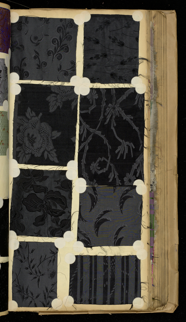 This is a Sample book. It is dated 1890–1910 and we acquired it in 1914. Its medium is silk, paper, cardboard. It is a part of the Textiles department.