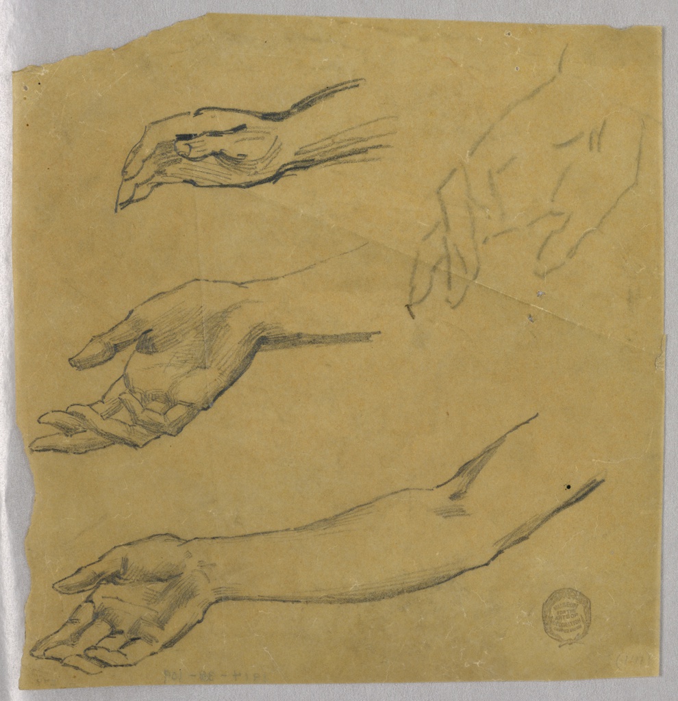 Drawing, Three Studies of a Hand and Arm; Francis Augustus Lathrop (American, 1849 - 1909); USA; graphite on tracing paper; 21.4 × 20.9 cm (8 7/16 × 8 1/4 in.); 1914-38-109