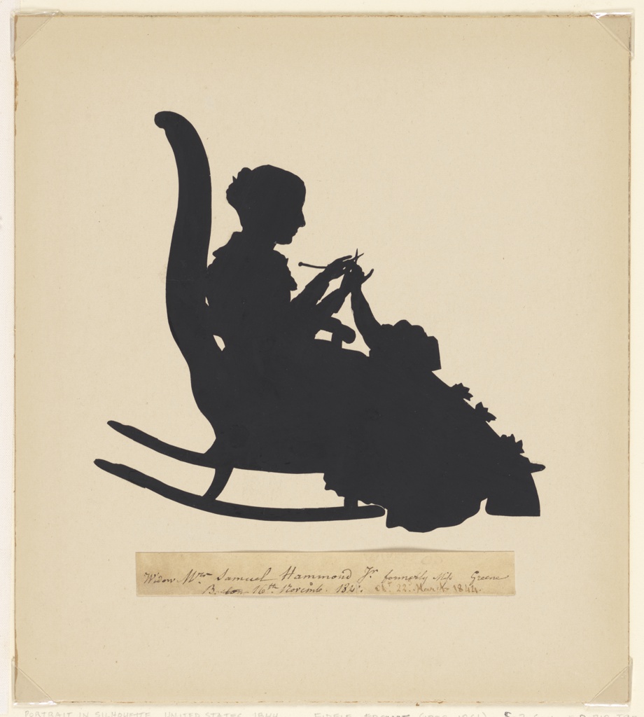 Manuscript label on recto: "Widow Mrs. Samuel Hammong Jr. formerly Miss Greene, Boston 16th Novemb. 1841. Oct. 22nd March 1844." Inscription on verso: "Mrs. Sam Hammond Jr. Boston, Novber 16th 1841." Black frame labelled: "This silhouette... was cut by August Edouart during his visit to the U.S. 1839-1849. ARthur S. Vernay 12 East 45th Street New York."