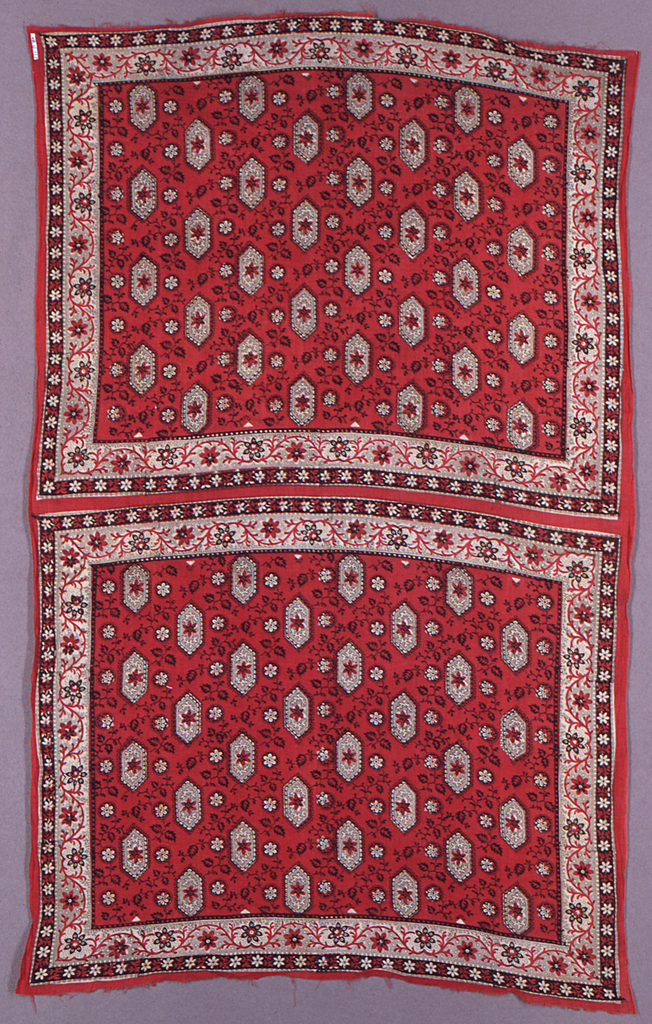 This is a Uncut handkerchiefs. It is dated ca. 1870 and we acquired it in 1916. Its medium is cotton and its technique is block printed and resist printed on plain weave. It is a part of the Textiles department.