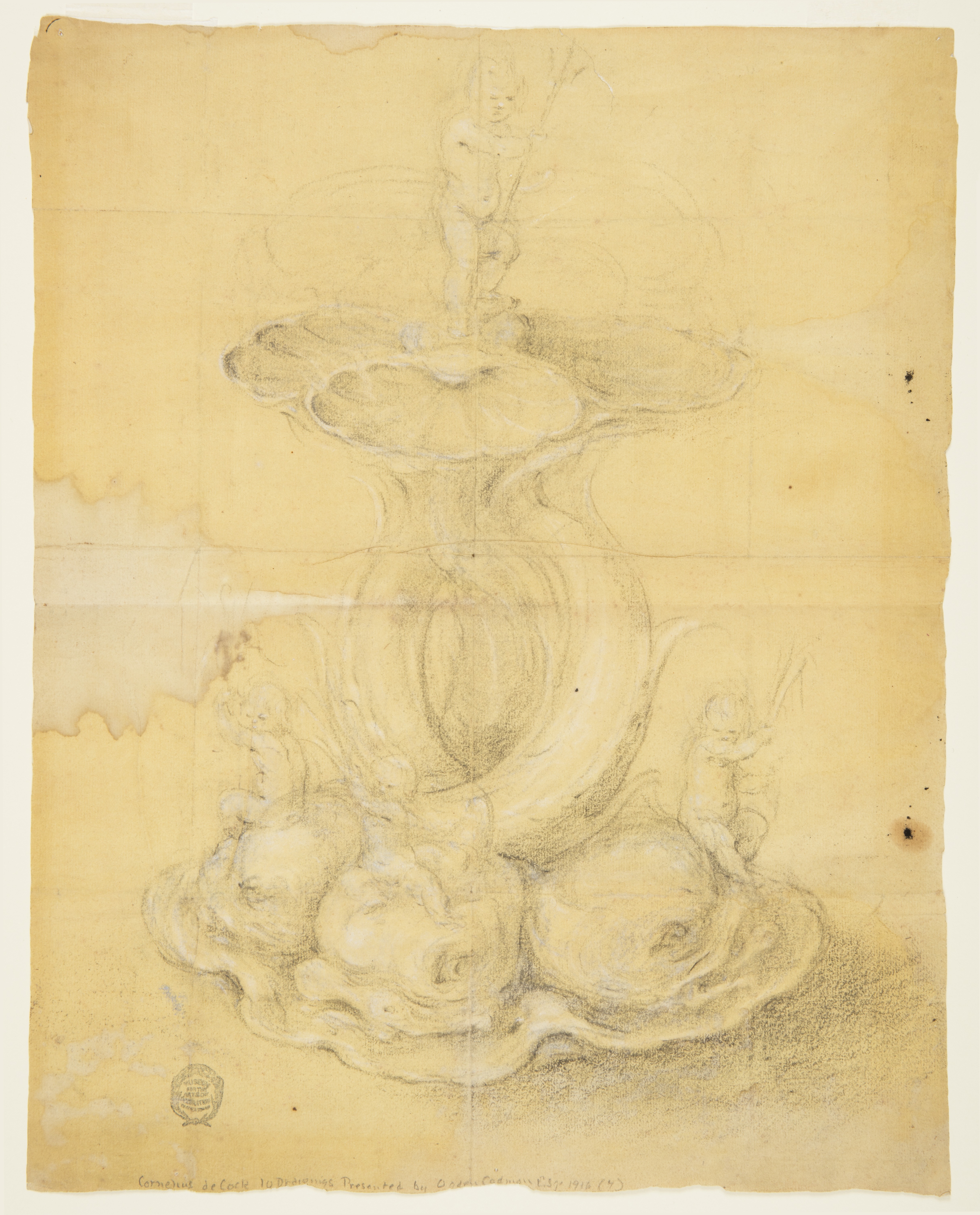 Recto: across bottom of sheet in graphite: Cornelius de Cock 10 Drawings Presented by Ogden Codman Esq. 1916 (7) verso in brown ink: "Twapon hobb inde gouar/ vylbusse/ gelegt dot hyr / toobehoort." (See card for more details.)