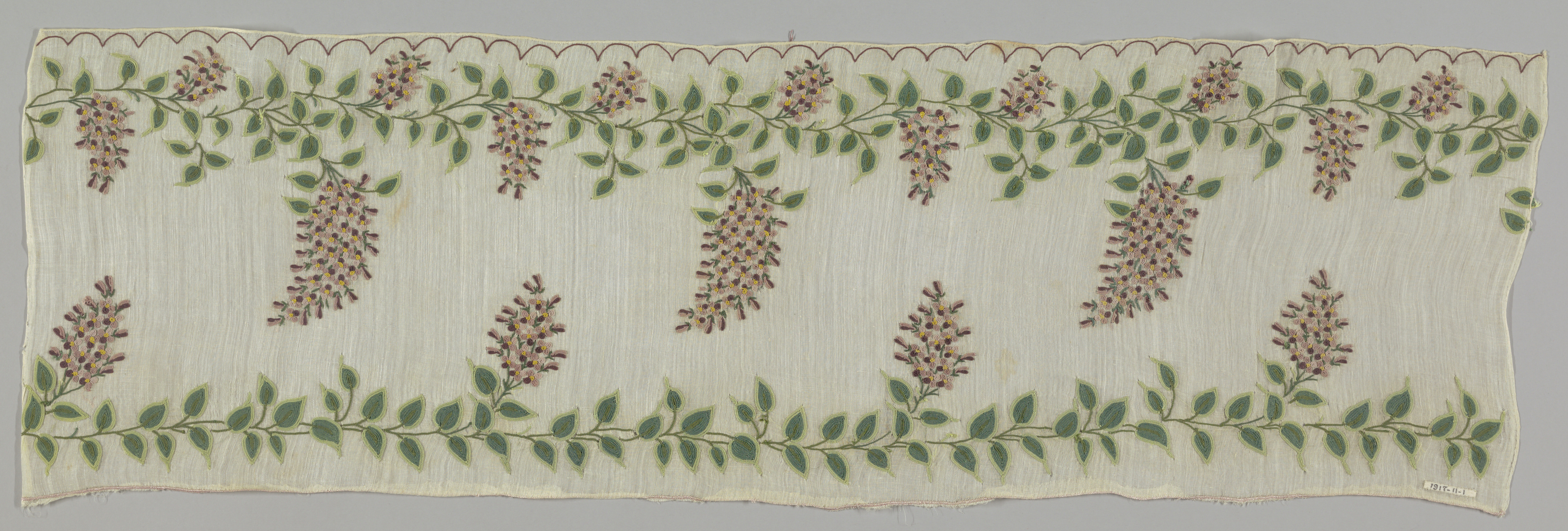 This is a Textile. It is dated ca. 1805 and we acquired it in 1917. Its medium is cotton on linen foundation and its technique is tambour work on plain weave. It is a part of the Textiles department.