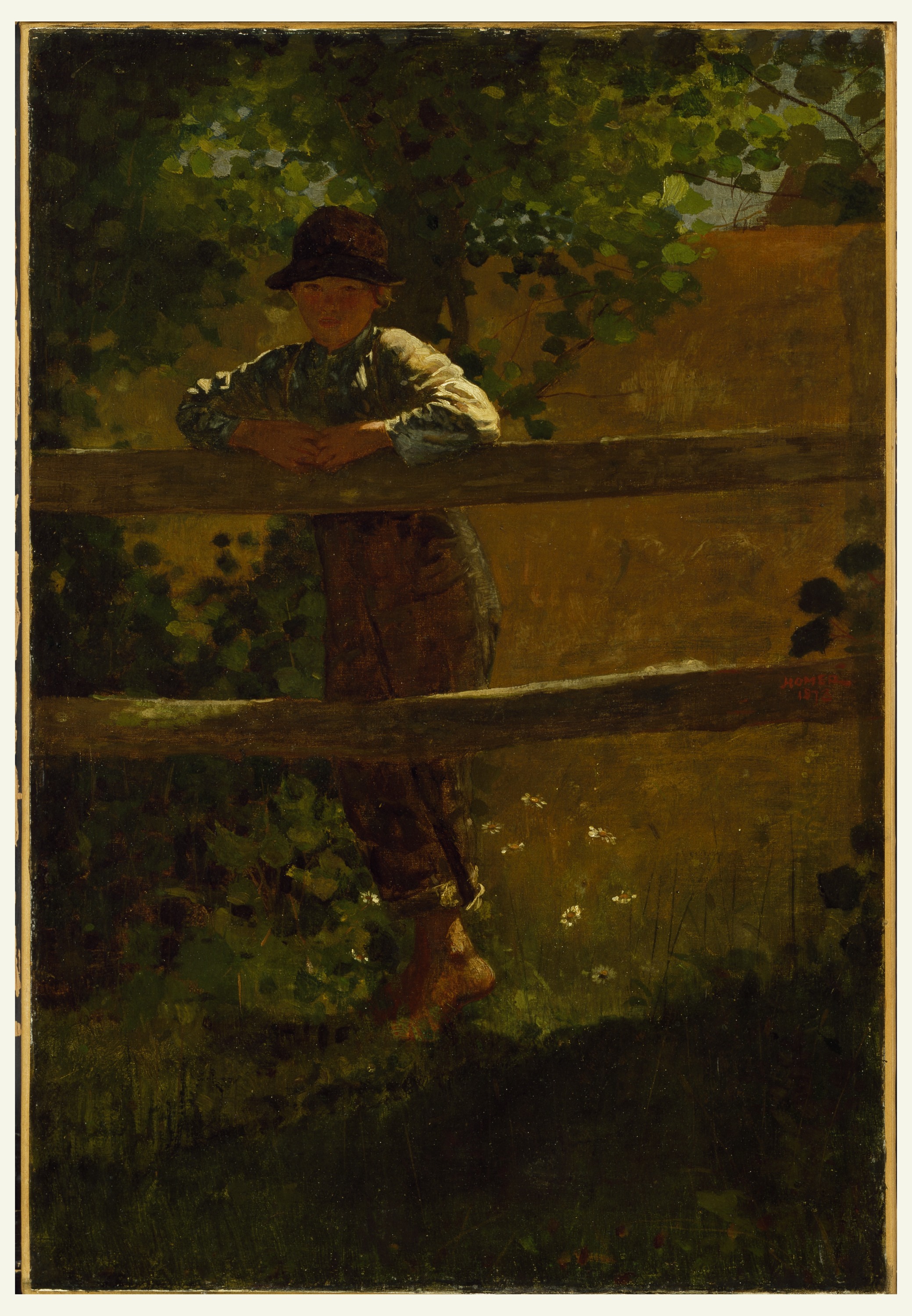 Signed and dated in brush and red oil paint, at right on fence: HOMER / 1873.