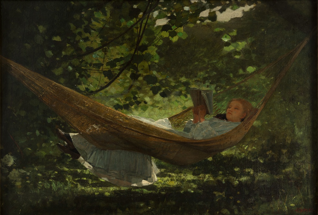 Winslow Homer’s 1873 oil painting titled, Sunlight and Shadow—In the Hammock, depicts an idyllic scene of tranquil bourgeois leisure in a pastoral setting. The scene portrays a young middle-to-upper class woman, indicated by her well-maintained white dress and refined shoes, reading peacefully in a hammock. Stretching from one end of the canvas to the other, the woven hammock and its sitter appear to be floating amongst the varied green leaves and black branches. Her face is softly defined and relaxed; as her body and dangling skirt hem swing amongst light dappled trees. Critic Holland Cotter has said that Homer’s “apple scented mid-1870s images of upstate New York farms and schools…reflect a mood of national nostalgia as the country’s Centennial approached.”[1]