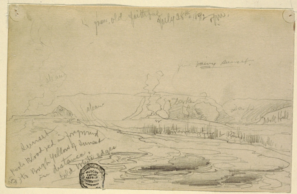 Recto: Inscribed in graphite at top: from Old Faithful July 28th 1892 T. M.; and again, lower left: sunset / pools. Blood red in foreground/ to Brigh [t] yellow of sunset/ in distance/ cold white edges; and notations at various points: "steam', "darker", etc. Verso: Inscribed in ?: No. 131.