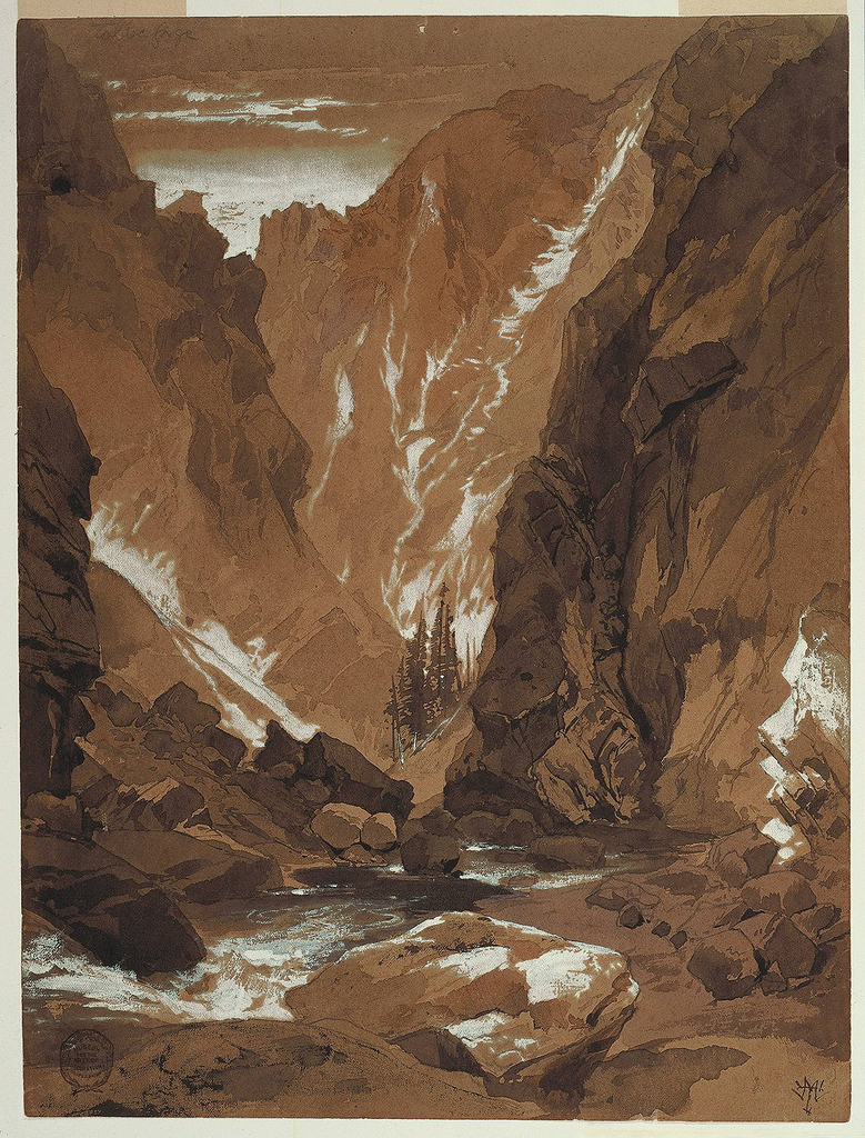 Drawing, Toltec Gorge, Colorado; Thomas Moran (American, b. Britain, 1837–1926); USA; brush and black, brown and blue ink washes, white gouache, graphite on buff wove paper verso: graphite with touches of brush and white gouache on tan wove paper; 31.9 x 24.1 cm (12 9/16 x 9 1/2 in.); Gift of Thomas Moran; 1917-17-68