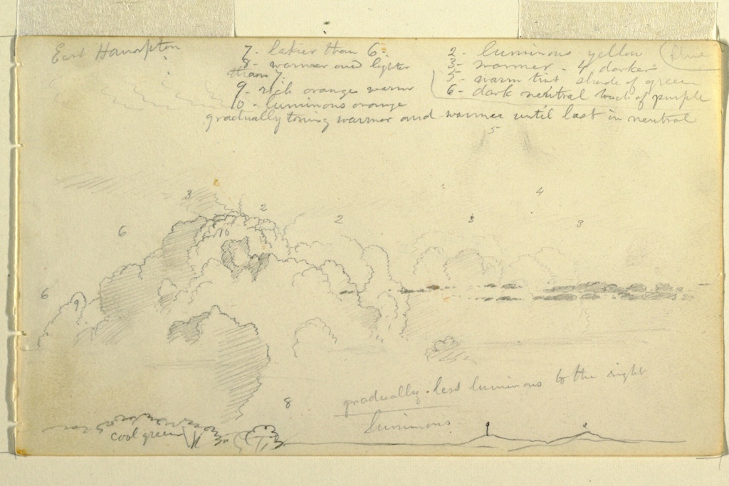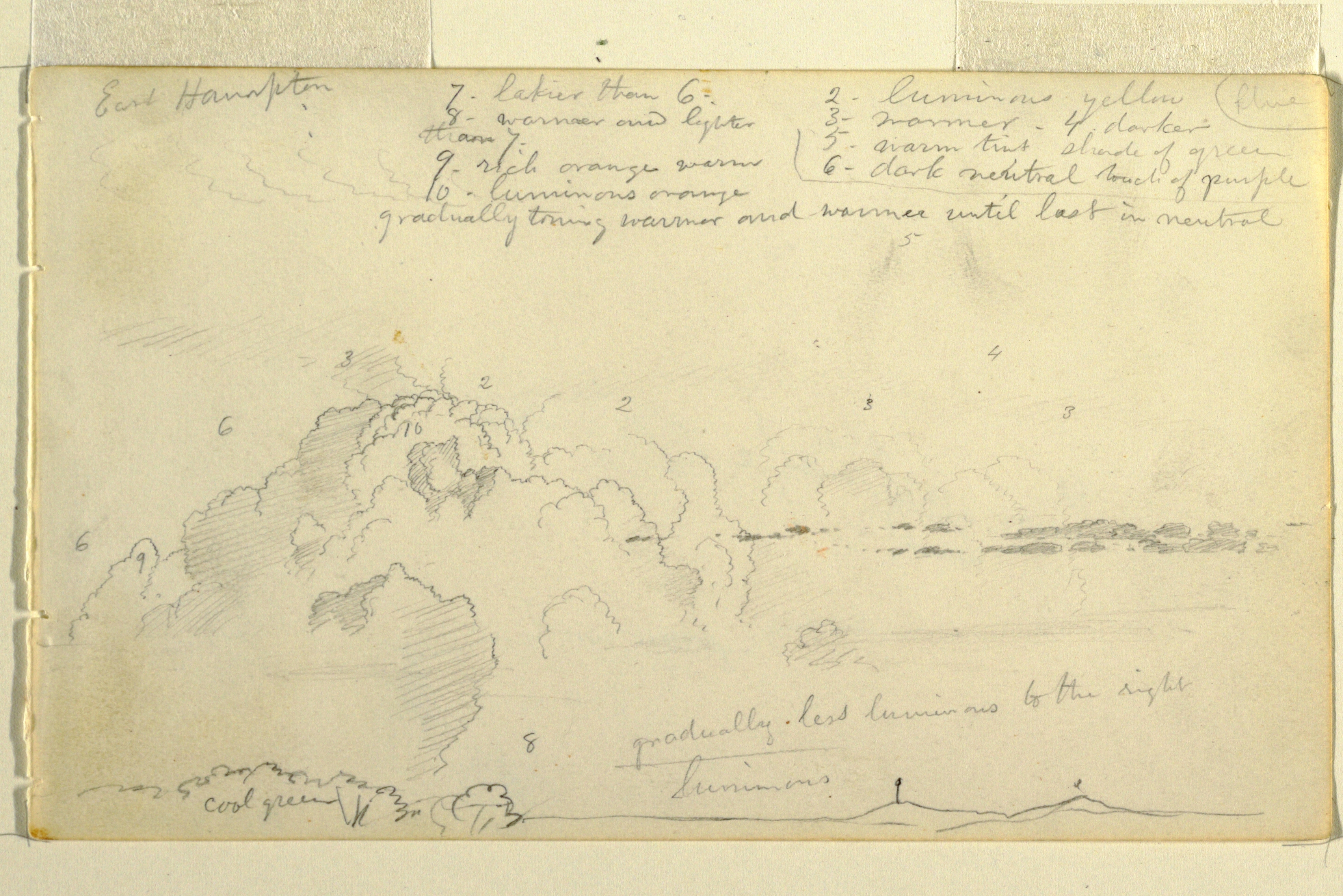 Inscribed: in graphite, upper left: East Hampton; in graphite, upper center: 7 - lakier than 6 - / 8 - warmer and lighter than 7 - / 9 - rich orange warm / 10 - luminous orange / gradually turning warmer and warmer until lost in neutral; in graphite, upper right: blue / 2 - luminous yellow / 3 - warmer - 4 - darker / 5 - warm tint shade of green / 6 - dark neutral touch of purple / 5; in graphite, center left: 3 2 / 6 10 / 6 9; in graphite, center: 2 3; in graphite, center right: 4 / 3; in graphite, lower left: 8 / cool green; in graphite, lower center: gradually less luminous to the right / luminous; in graphite, verso upper center: Blue; in graphite, verso center left: blue/ neut / 2 2; in graphite, center right: luminous red / concentrated
