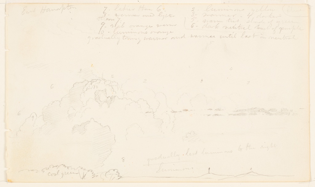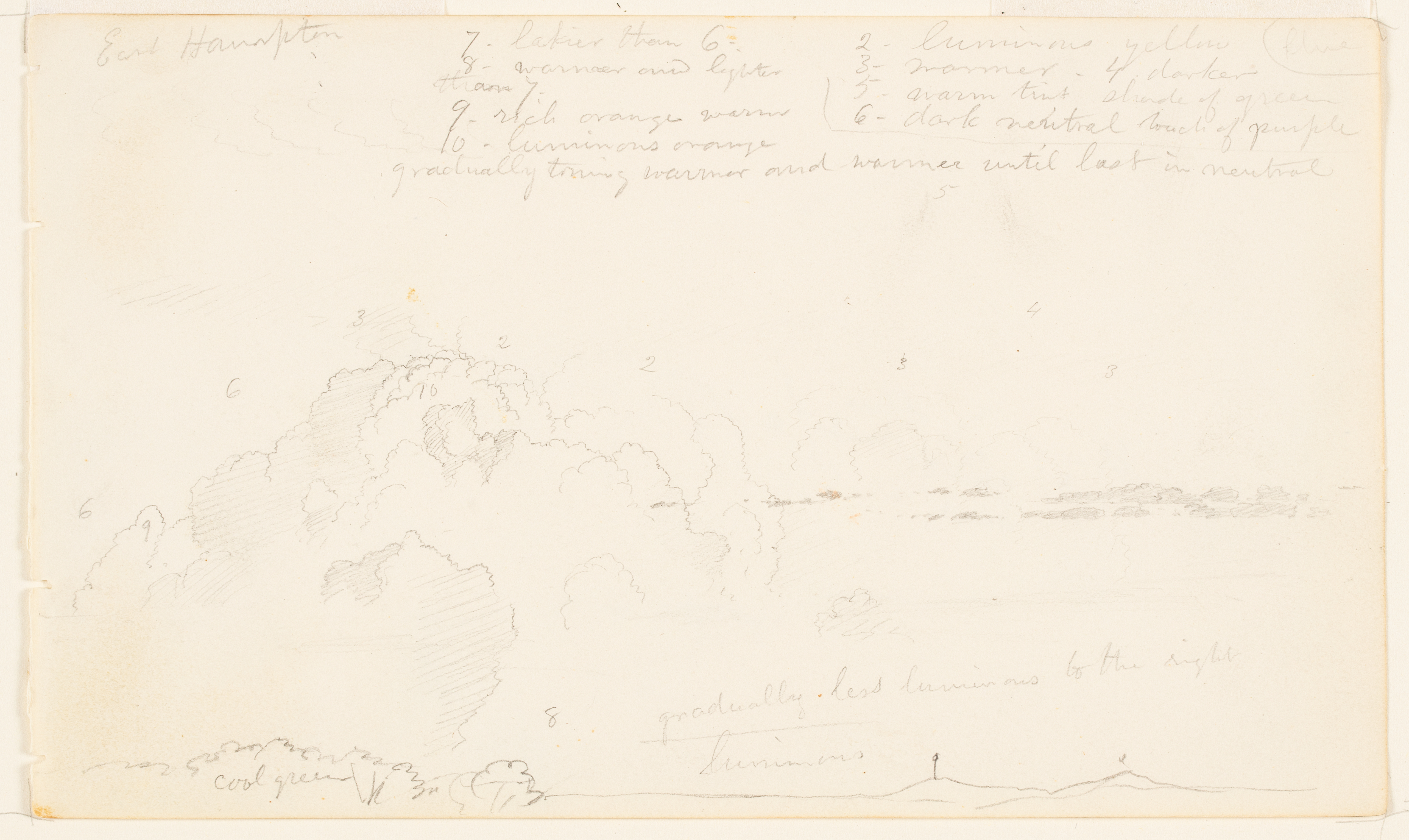 Inscribed: in graphite, upper left: East Hampton; in graphite, upper center: 7 - lakier than 6 - / 8 - warmer and lighter than 7 - / 9 - rich orange warm / 10 - luminous orange / gradually turning warmer and warmer until lost in neutral; in graphite, upper right: blue / 2 - luminous yellow / 3 - warmer - 4 - darker / 5 - warm tint shade of green / 6 - dark neutral touch of purple / 5; in graphite, center left: 3 2 / 6 10 / 6 9; in graphite, center: 2 3; in graphite, center right: 4 / 3; in graphite, lower left: 8 / cool green; in graphite, lower center: gradually less luminous to the right / luminous; in graphite, verso upper center: Blue; in graphite, verso center left: blue/ neut / 2 2; in graphite, center right: luminous red / concentrated