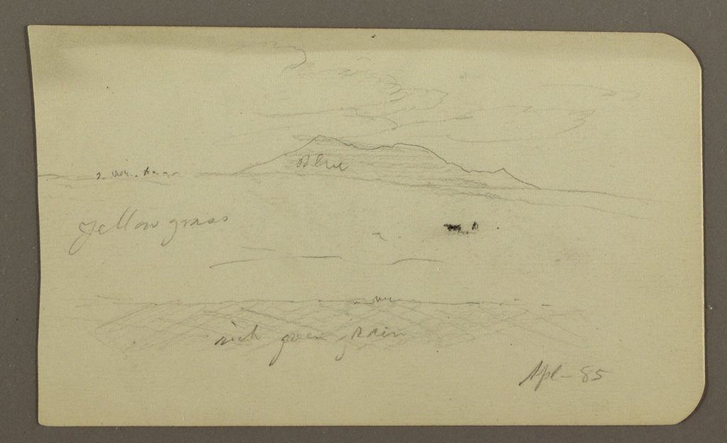 Inscribed: in graphite, upper center: Blue; in graphite, center left: yellow grass; in graphite, lower center: rich green grain; in graphite, lower right: Apl- 85