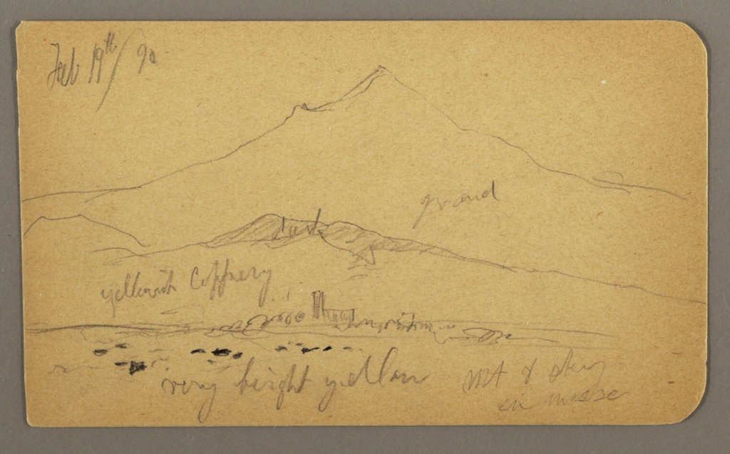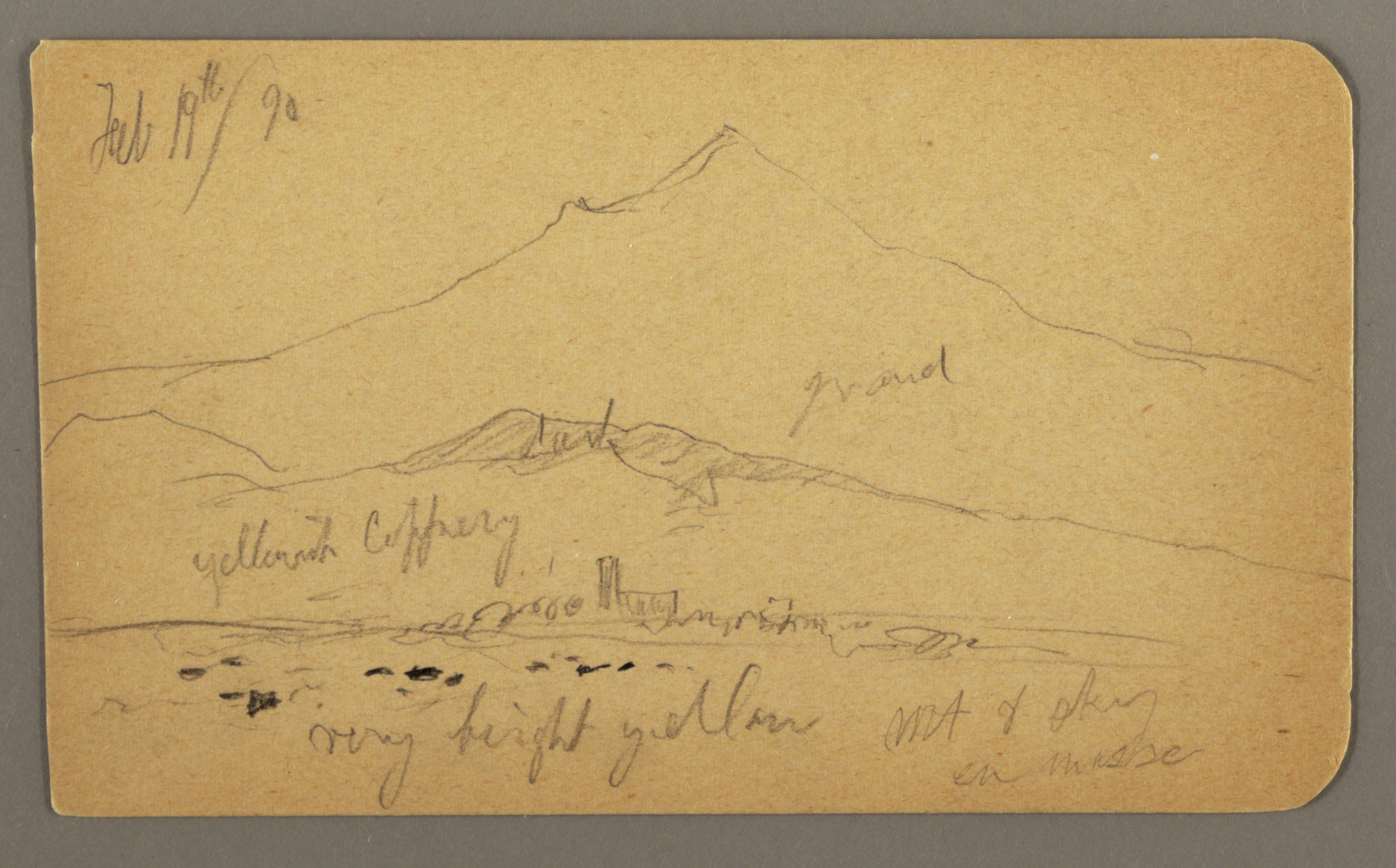 Inscribed: in graphite, upper left: Feb 19th /90; in graphite, center: grand / dark / yellowish coppery; in graphite, lower margin: very bright yellow / Mt & sky / en masse