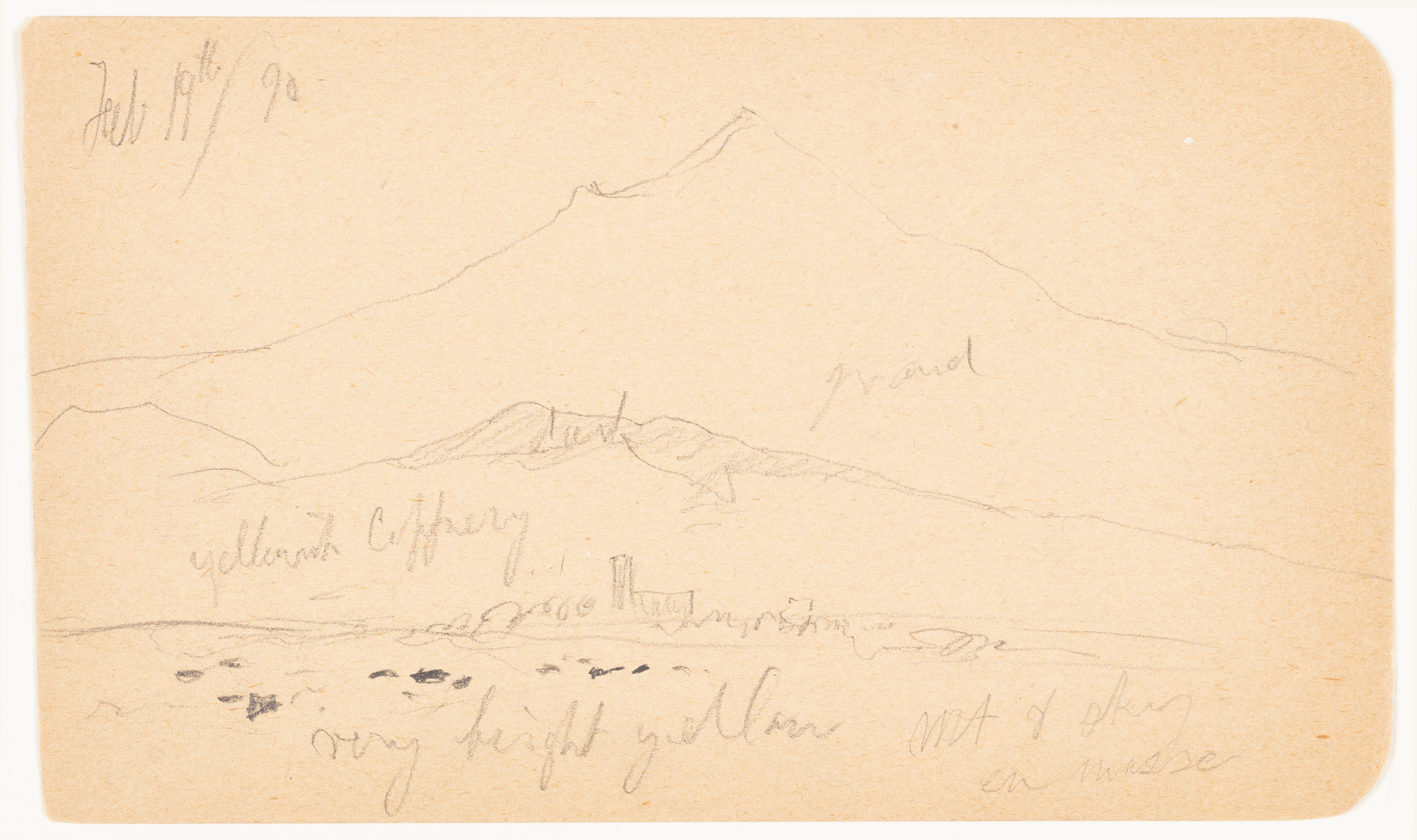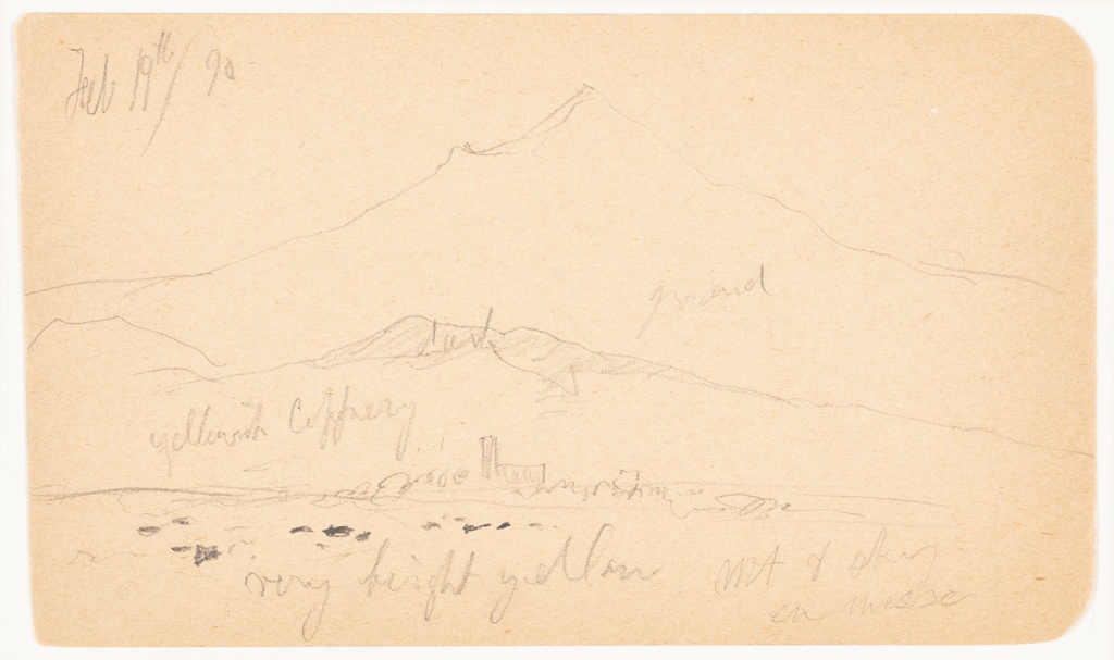 Inscribed: in graphite, upper left: Feb 19th /90; in graphite, center: grand / dark / yellowish coppery; in graphite, lower margin: very bright yellow / Mt & sky / en masse