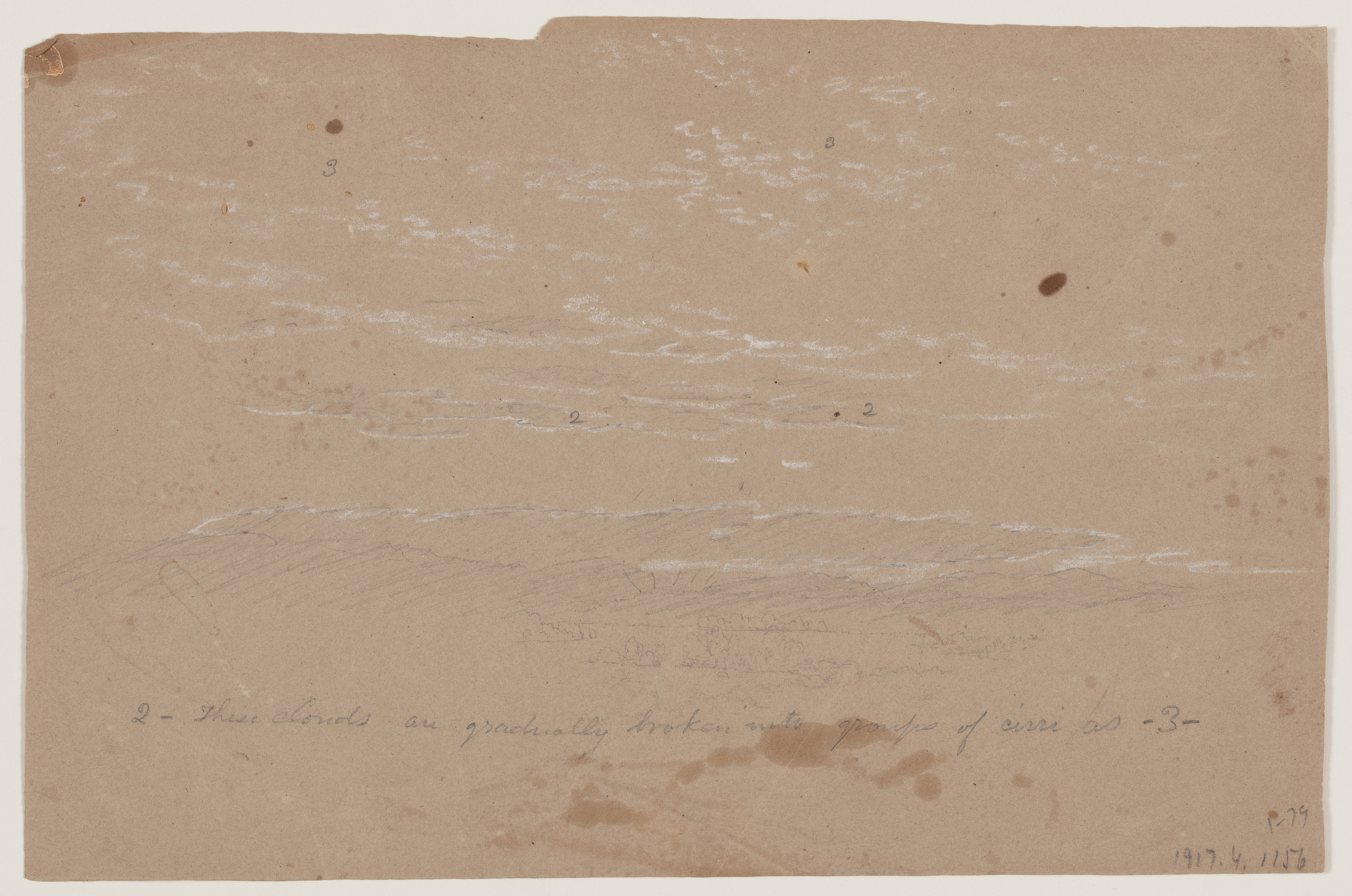 Inscribed: in graphite, verso upper center: 3 3; in graphite, verso center: 2 2; in graphite, verso lower center: 2 - These clouds are gradually broken into groups of cirri as -3-; in graphite, right margin: 2000 / 10000 / 1800 / 5 / 10[--] / 100 / [horizontal line] / 100 [---]