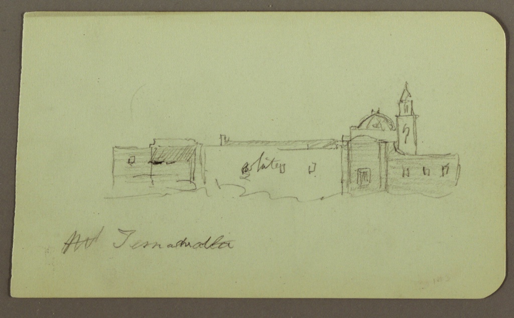 Drawing, Parish of San Juan Bautista, Temamatla, Mexico; Frederic Edwin Church (American, 1826–1900); USA; graphite on light green wove paper; verso: graphite ; 10.3 × 17.5 cm (4 1/16 × 6 7/8 in.); Gift of Louis P. Church; 1917-4-1225